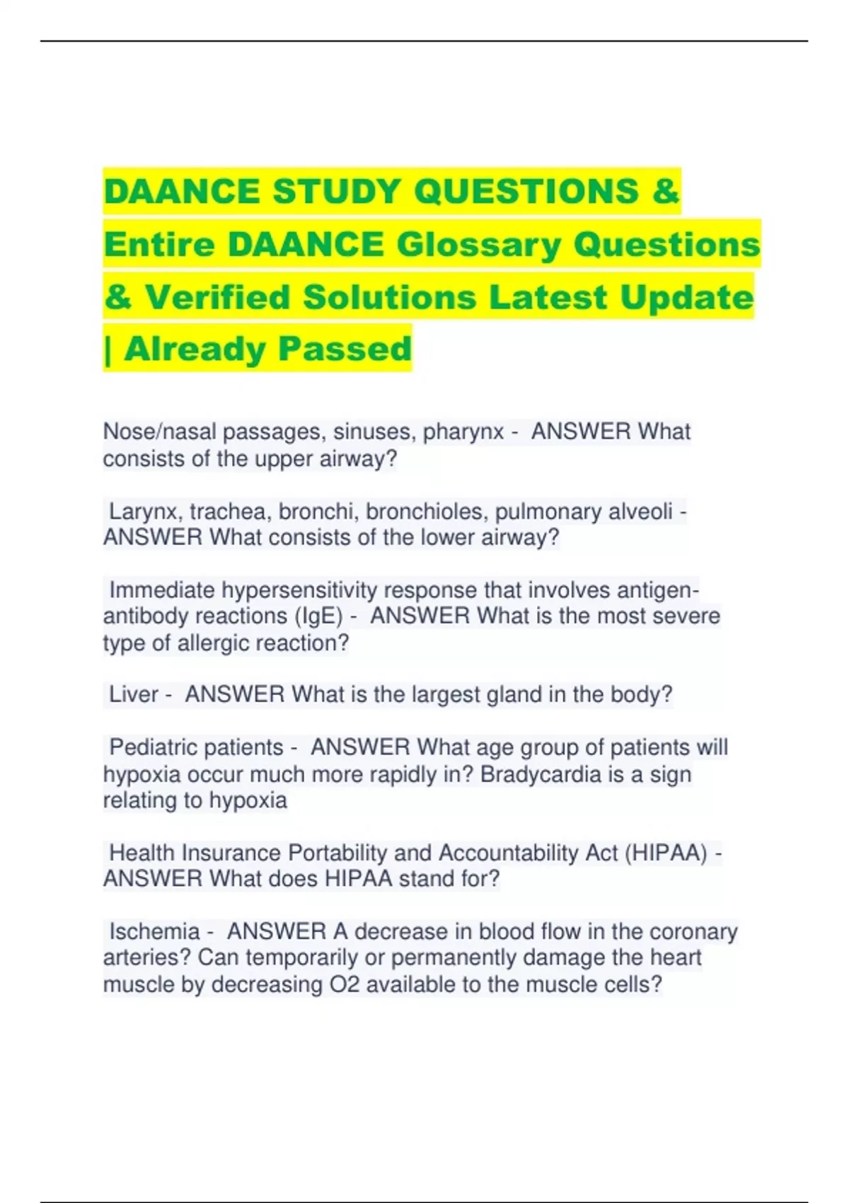 DAANCE STUDY QUESTIONS & Entire DAANCE Glossary Questions & Verified Solutions Latest Update | Already Passed Nose/nasal passages, sinuses, pharynx - ANSWER What consists of the upper airway? Larynx, trachea, bronchi, bronchioles, pulmonary alveoli - ANSWER What consists of the lower airway? Immediate hypersensitivity response that involves antigenantibody reactions (IgE) - ANSWER What is the most severe type of allergic reaction? Liver - ANSWER What is the largest gland in the body? Pediatric patients - ANSWER What age group of patients will hypoxia occur much more rapidly in? Bradycardia is a sign relating to hypoxia Health Insurance Portability and Accountability Act (HIPAA) - ANSWER What does HIPAA stand for? Ischemia - ANSWER A decrease in blood flow in the coronary arteries? Can temporarily or permanently damage the heart muscle by decreasing O2 available to the muscle cells? 1 year- Plavix & Aspirin - ANSWER If a cardiac patient just had stent placement, how long are they required to be on antiplatelet drugs? What are the 2 drugs they usually do together? Subacute Bacterial Endocarditis (SBE) aka infectious endocarditis - ANSWER Type of infection that can further damage heart valves or cause systemic infections? Requires antibiotic prophylaxis P wave - ANSWER Atrial depolarization (contraction) QRS complex - ANSWER Ventricular depolarization T wave - ANSWER Ventricular repolarization (relaxation) Cushing's disease - ANSWER Type of disease due to excessive secretion of corticosteroid due to a presence of a tumor or from administration of high doses of corticosteriod drugs (ex: Prednisone) Myxedema - ANSWER Chronic long-term hypothyroidism, most commonly seen in older adults (elderly women) who have had a stroke or stopped taking their thyroid medication Thyroid crisis - ANSWER Most severe complication of hyperthyroidism from an OMS perspective Hyperthyroidism - ANSWER Untreated __________ are at an increased risk for outpatient anesthesia and tend to be sensitive to epinephrine in a local anesthetic Diabetes Type 1 - ANSWER Insulin-dependent Diabetes Type 2 - ANSWER Non-insulin dependent Elevated LFTs (Liver function tests) - ANSWER Elevated level of several liver enzymes and bilirubin is often termed? Women - ANSWER What gender is Propofol more rapidly redistributed in and require 10-15% larger dose? Children - ANSWER What age group would Propofol redistribute very rapidly, and require at least 50% increase in drug dose? Diffusion hypoxia - ANSWER What is a complication of N2O rapidly moving from blood to alveoli of lungs, and displaces other gases, including O2 General anesthesia - ANSWER Patient is not aroused, even during painful stimulation. R