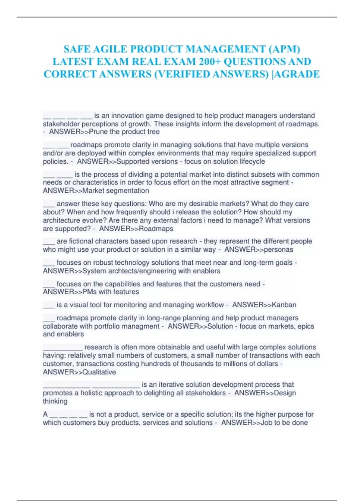 SAFE AGILE PRODUCT MANAGEMENT (APM) LATEST EXAM REAL EXAM 200+ QUESTIONS AND CORRECT ANSWERS (VERIFIED ANSWERS) AGRADE