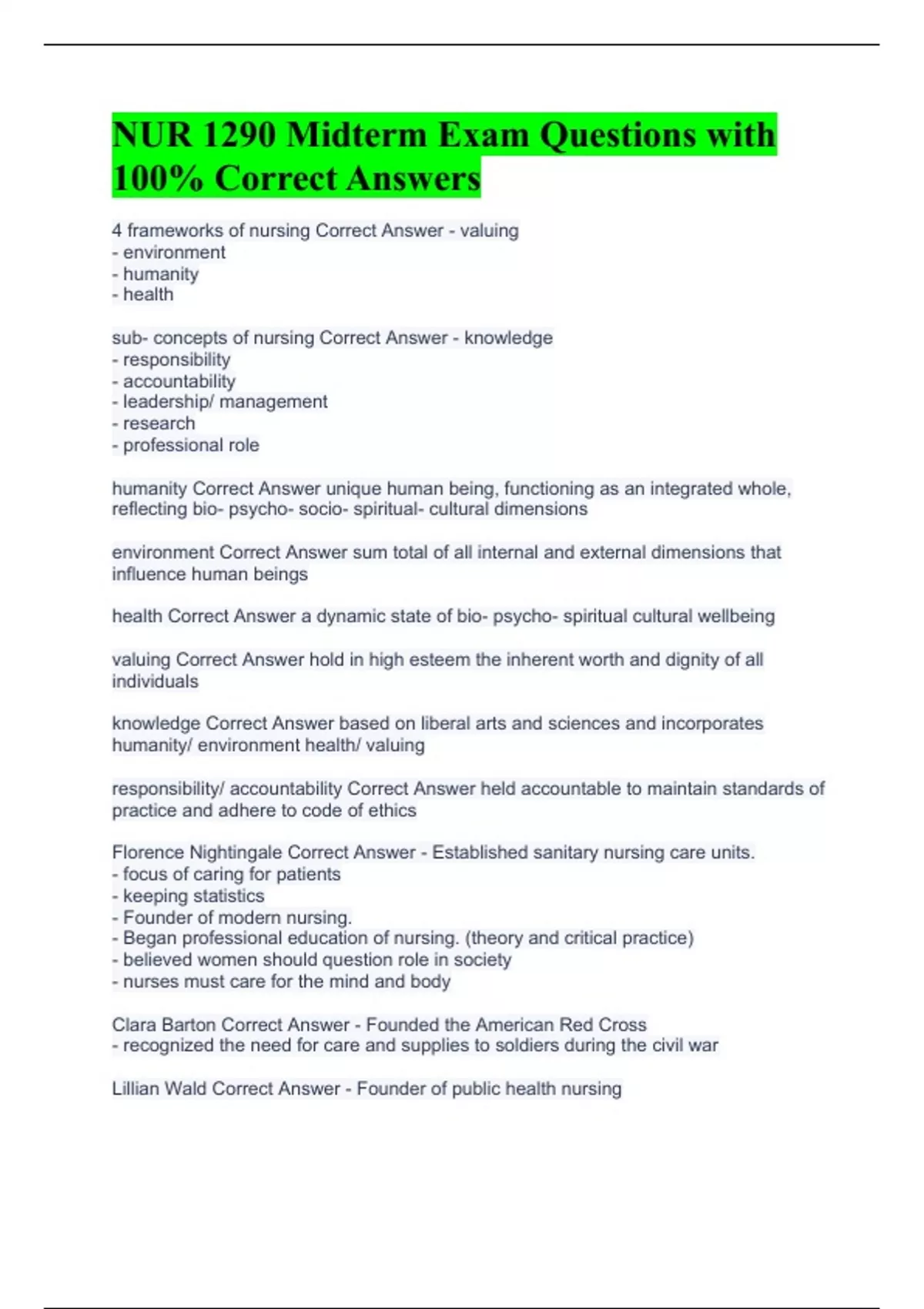 4 frameworks of nursing Correct Answer - valuing - environment - humanity - health sub- concepts of nursing Correct Answer - knowledge - responsibility - accountability - leadership/ management - research - professional role humanity Correct Answer unique human being, functioning as an integrated whole, reflecting bio- psycho- socio- spiritual- cultural dimensions environment Correct Answer sum total of all internal and external dimensions that influence human beings health Correct Answer a dynamic state of bio- psycho- spiritual cultural wellbeing valuing Correct Answer hold in high esteem the inherent worth and dignity of all individuals knowledge Correct Answer based on liberal arts and sciences and incorporates humanity/ environment health/ valuing responsibility/ accountability Correct Answer held accountable to maintain standards of practice and adhere to code of ethics Florence Nightingale Correct Answer - Established sanitary nursing care units. - focus of caring for patients - keeping statistics - Founder of modern nursing. - Began professional education of nursing. (theory and critical practice) - believed women should question role in society - nurses must care for the mind and body Clara Barton Correct Answer - Founded the American Red Cross - recognized the need for care and supplies to soldiers during the civil war Lillian Wald Correct Answer - Founder of public health nursing