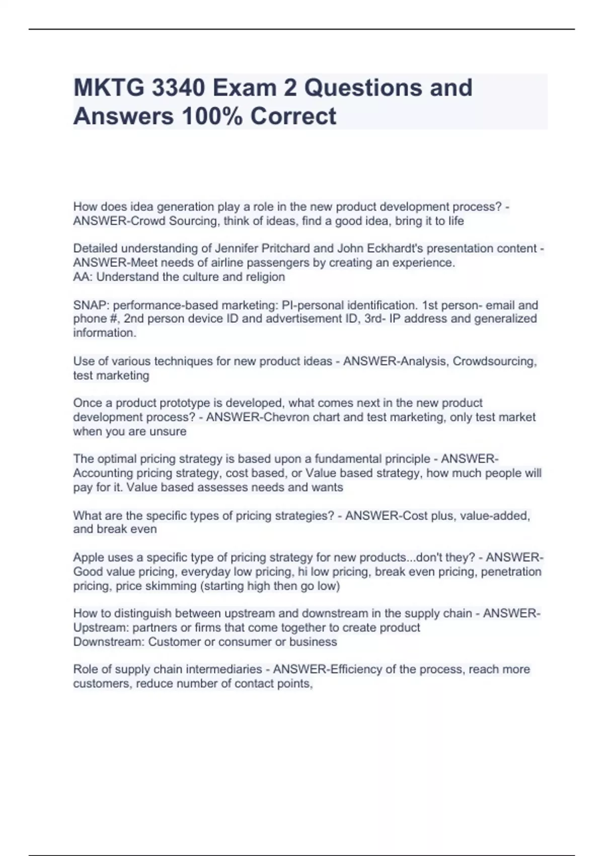 MKTG 3340 Exam 2 Questions and Answers 100% CorrectMKTG 3340 Exam 2 Questions and Answers 100% CorrectMKTG 3340 Exam 2 Questions and Answers 100% CorrectMKTG 3340 Exam 2 Questions and Answers 100% Correct How does idea generation play a role in the new product development process? - ANSWER-Crowd Sourcing, think of ideas, find a good idea, bring it to life Detailed understanding of Jennifer Pritchard and John Eckhardt's presentation content - ANSWER-Meet needs of airline passengers by creating an experience. AA: Understand the culture and religion SNAP: performance-based marketing: PI-personal identification. 1st person- email and phone #, 2nd person device ID and advertisement ID, 3rd- IP address and generalized