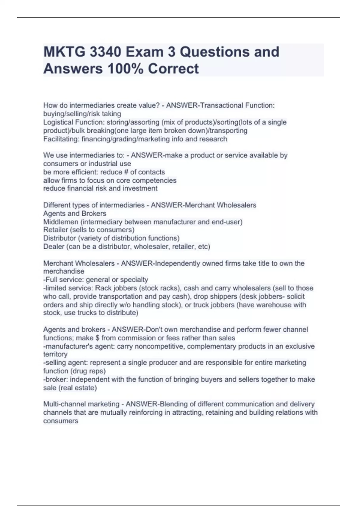 MKTG 3340 Exam 3 Questions and Answers 100% Correct MKTG 3340 Exam 3 Questions and Answers 100% Correct MKTG 3340 Exam 3 Questions and Answers 100% Correct How do intermediaries create value? - ANSWER-Transactional Function: buying/selling/risk taking Logistical Function: storing/assorting (mix of products)/sorting(lots of a single product)/bulk breaking(one large item broken down)/transporting Facilitating: financing/grading/marketing info and research We use intermediaries to: - ANSWER-make a product or service available by consumers or industrial use be more efficient: reduce # of contacts allow firms to focus on core competencies reduce financial risk and investment Different types of intermediaries - ANSWER-Merchant Wholesalers Agents and Brokers