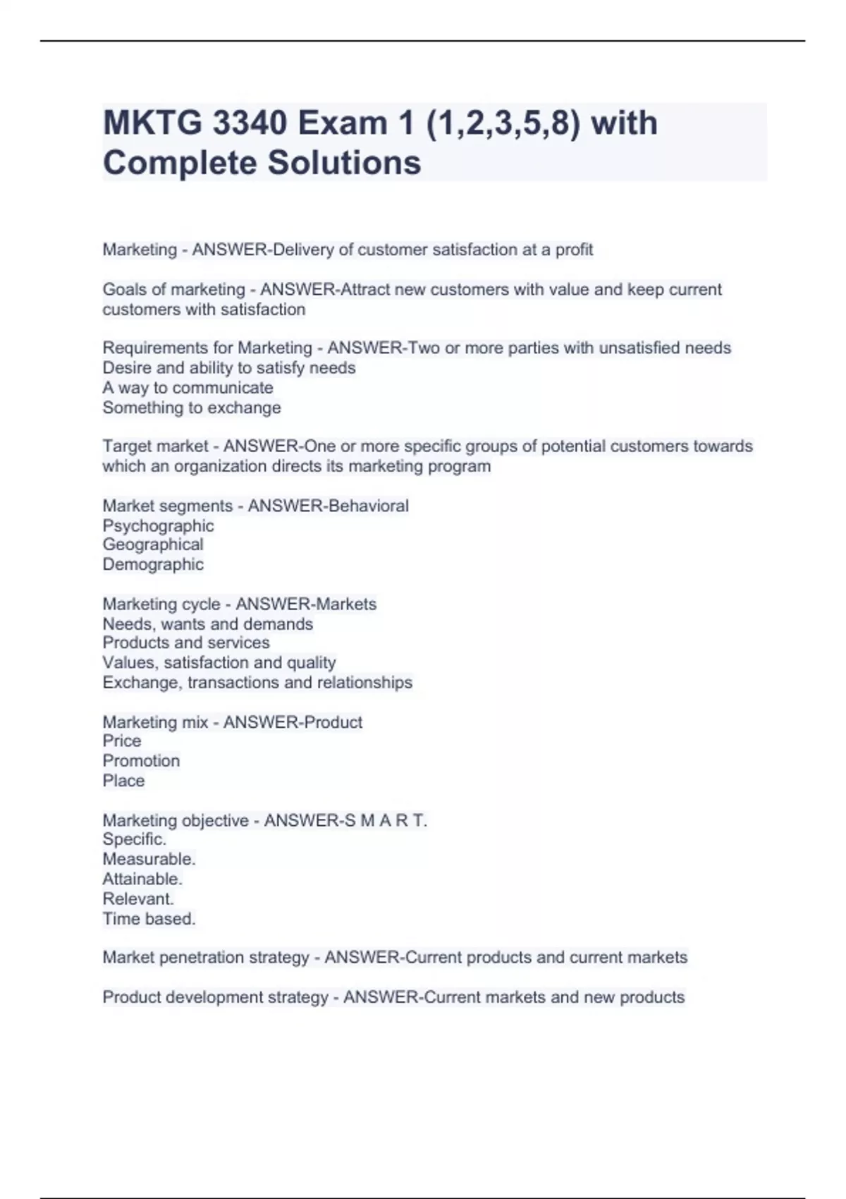 MKTG 3340 Exam 1 (1,2,3,5,8) with Complete Solutions MKTG 3340 Exam 1 (1,2,3,5,8) with Complete Solutions MKTG 3340 Exam 1 (1,2,3,5,8) with Complete SolutionsMarketing - ANSWER-Delivery of customer satisfaction at a profit Goals of marketing - ANSWER-Attract new customers with value and keep current customers with satisfaction Requirements for Marketing - ANSWER-Two or more parties with unsatisfied needs Desire and ability to satisfy needs A way to communicate Something to exchange Target market - ANSWER-One or more specific groups of potential customers towards which an organization directs its marketing program