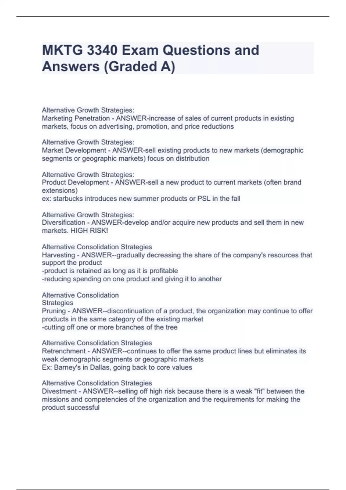 MKTG 3340 Exam Questions and Answers (Graded A) MKTG 3340 Exam Questions and Answers (Graded A) MKTG 3340 Exam Questions and Answers (Graded A) Alternative Growth Strategies: Marketing Penetration - ANSWER-increase of sales of current products in existing markets, focus on advertising, promotion, and price reductions Alternative Growth Strategies: Market Development - ANSWER-sell existing products to new markets (demographic segments or geographic markets) focus on distribution Alternative Growth Strategies: Product Development - ANSWER-sell a new product to current markets (often brand extensions) ex: starbucks introduces new summer products or PSL in the fall Alternative Growth Strategies: Diversification - ANSWER-develop and/or acquire new products and sell them in new markets. HIGH RISK!