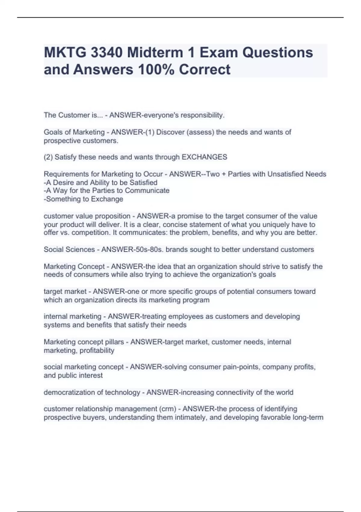 MKTG 3340 Midterm 1 Exam Questions and Answers 100% CorrectMKTG 3340 Midterm 1 Exam Questions and Answers 100% CorrectMKTG 3340 Midterm 1 Exam Questions and Answers 100% CorrectMKTG 3340 Midterm 1 Exam Questions and Answers 100% CorrectThe Customer is... - ANSWER-everyone's responsibility. Goals of Marketing - ANSWER-(1) Discover (assess) the needs and wants of prospective customers. (2) Satisfy these needs and wants through EXCHANGES Requirements for Marketing to Occur - ANSWER--Two + Parties with Unsatisfied Needs -A Desire and Ability to be Satisfied -A Way for the Parties to Communicate -Something to Exchange customer value proposition - ANSWER-a promise to the target consumer of the value your product will deliver. It is a clear, concise statement of what you uniquely have to