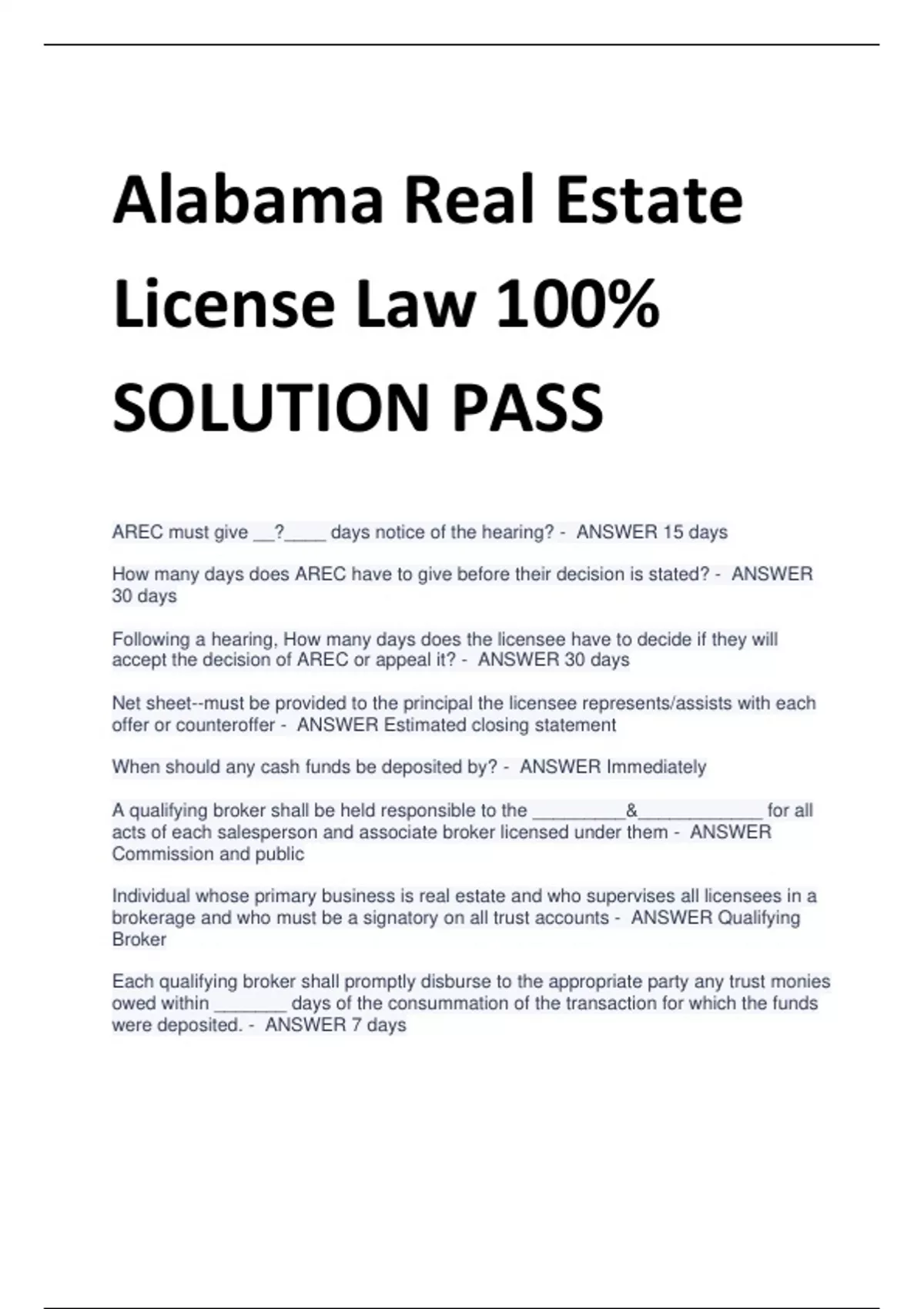 Alabama Real Estate License Law 100% SOLUTION PASS