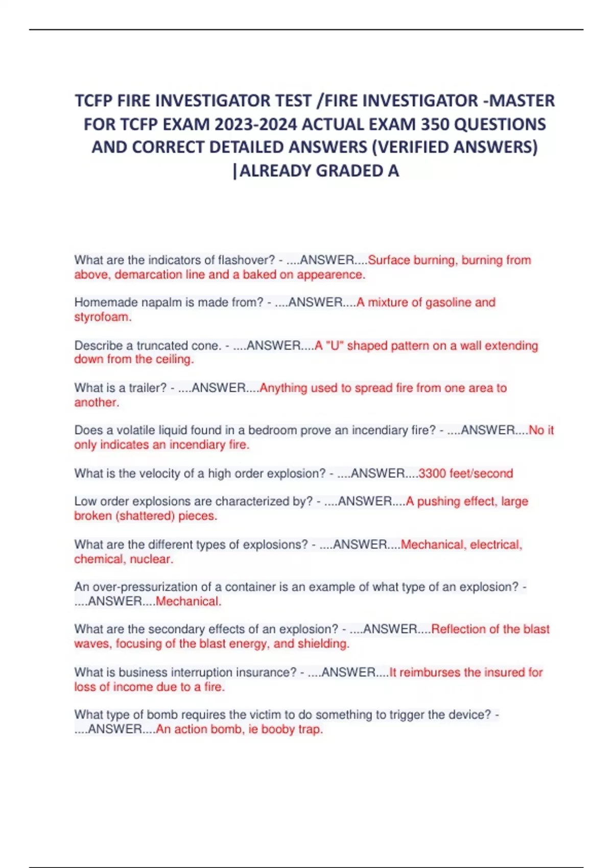 TCFP FIRE INVESTIGATOR TEST /FIRE INVESTIGATOR -MASTER FOR TCFP EXAM ACTUAL EXAM 350 QUESTIONS AND CORRECT DETAILED ANSWERS (VERIFIED ANSWERS) |ALREADY GRADED A