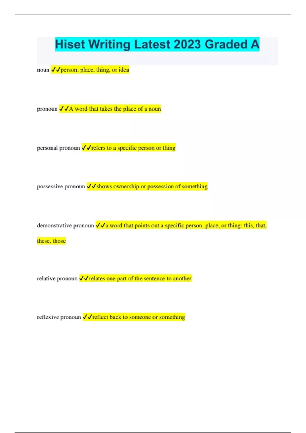 Hiset Writing Latest 2023 Graded A noun person, place, thing, or idea pronoun A word that takes the place of a noun personal pronoun refers to a specific person or thing possessive pronoun shows ownership or possession of something demonstrative pronoun a word that points out a specific person, place, or thing: this, that, these, those relative pronoun relates one part of the sentence to another reflexive pronoun reflect back to someone or something interrogative pronoun pronoun that asks a question; examples: who, whom, whose, what, which indefinite pronoun refers to a person, place, thing, or idea that may or may not be specifically named adjective a word that modifies a noun or pronoun article a, an, the determiners make specific sense of a noun verb A word that expresses action, a state of being or feeling, or a relation between two things action verb A verb that expresses either physical or mental activity transitive action verb MUST have a direct object intransitive action verb will NEVER have a direct object being verb shows state of being forms of be am, is, are, was, were, be, been, being, has been, should have been, may be, might be linking verb A verb that does not show action but connects the subject with a word in the predicate linking verb examples became, seem, feel, remain, appear, look, smell, stay, become, grow, prove, sound, taste helping verb helps the main verb tell about an action or make a statement Common helping verbs am, are, be, been, could, have, will, were, might, has regular verb a verb that forms the past tense by adding "ed" to the basic verb irregular verb A verb in which the past tense is not formed by adding the usual -ed ending. adverb A word that modifies a verb, an adjective, or another adverb conjunctive adverb used to express relationships between independent clauses (join short choppy sentences into more complex thoughts) rules of conjunctive adverb -complex thought on either side - has a semicolon before and a comma after it -joined two closely related thoughts -is the right conjunctive adverb positive degree makes a statement about a person, place, or thing comparative degree compares only two people, places, or things superlative degree used when three or more people or things are being compared Preposition A word that shows the relationship of a noun or pronoun to another word Conjunction Joins words or groups of words coordinating conjunction FANBOYS=for, and, nor, but, or, yet, so correlative conjunctions both/and either/or neither/nor not only/but also subordinating conjunctions used at the beginning of clauses to create dependent clauses (words that have a subject and verb but which cannot stand alone) Interjection A word that expresses emotion complete subject consists of the subject and any words related to it complete predicate consists of a verb and all the words that describe the verb and complete its meaning simple subject the main word or word group that tells whom or what the sentence is about simple predicate the verb in the sentence which expresses what is said about the subject direct object receives the action of the verb object complement elaborates on or gives a fuller meaning to a direct object indirect object tells to whom or for whom the action of the verb is done subject complements The words that follow a linking verb and identify or describe the subject predicate adjective An adjective that follows a linking verb and describes the subject predicate nominative a noun or pronoun that follows a linking verb and renames or identifies the subject prepositional phrase A group of words that begins with a preposition and ends with a noun or pronoun. clauses group of words with a subject and verb independent clause expresses a complete thought and can stand alone as a sentence subordinate clause does not express a complete thought and cannot stand alone as a sentence