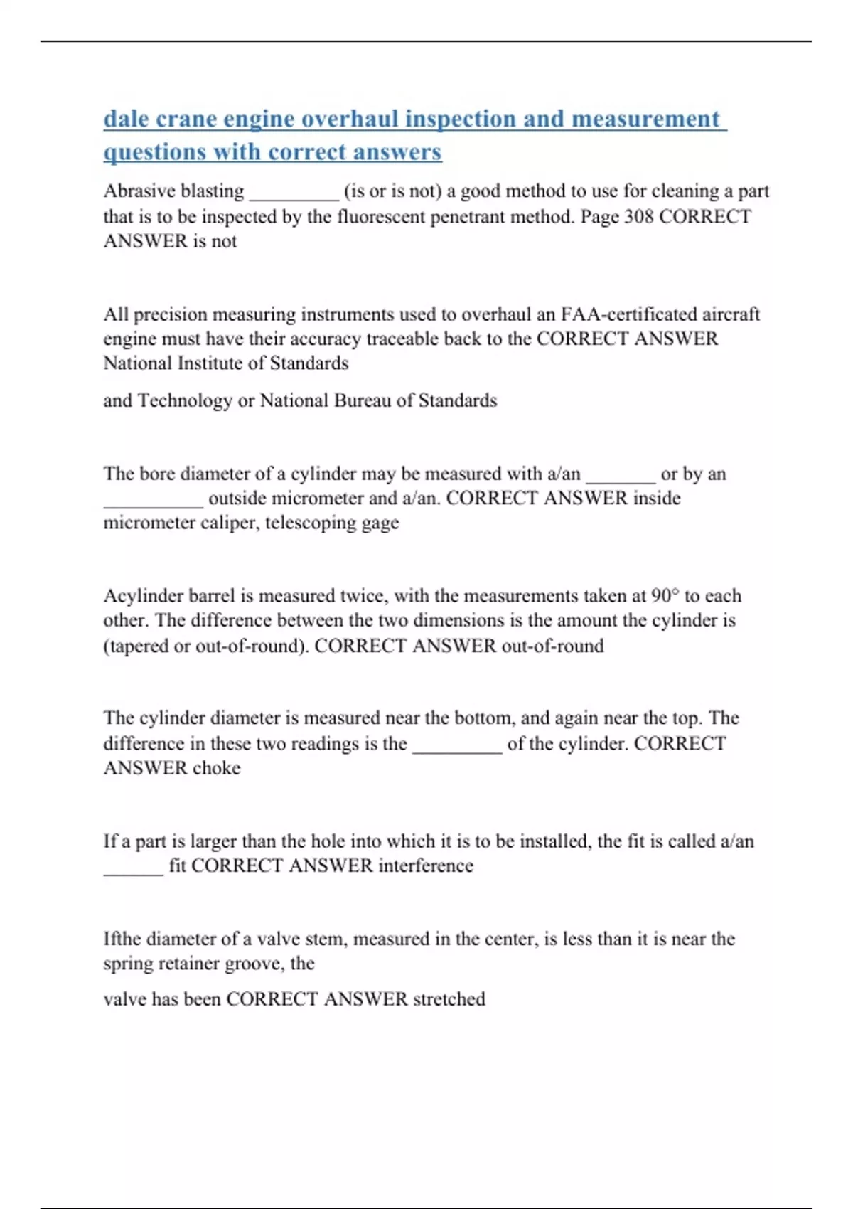 Abrasive blasting _________ (is or is not) a good method to use for cleaning a part that is to be inspected by the fluorescent penetrant method. Page 308 CORRECT ANSWER is not All precision measuring instruments used to overhaul an FAA-certificated aircraft engine must have their accuracy traceable back to the CORRECT ANSWER National Institute of Standards and Technology or National Bureau of Standards The bore diameter of a cylinder may be measured with a/an _______ or by an __________ outside micrometer and a/an. CORRECT ANSWER inside micrometer caliper, telescoping gage Acylinder barrel is measured twice, with the measurements taken at 90° to each other. The difference between the two dimensions is the amount the cylinder is (tapered or out-of-round). CORRECT ANSWER out-of-round The cylinder diameter is measured near the bottom, and again near the top. The difference in these two readings is the _________ of the cylinder. CORRECT ANSWER choke If a part is larger than the hole into which it is to be installed, the fit is called a/an ______ fit CORRECT ANSWER interference Ifthe diameter of a valve stem, measured in the center, is less than it is near the spring retainer groove, the
