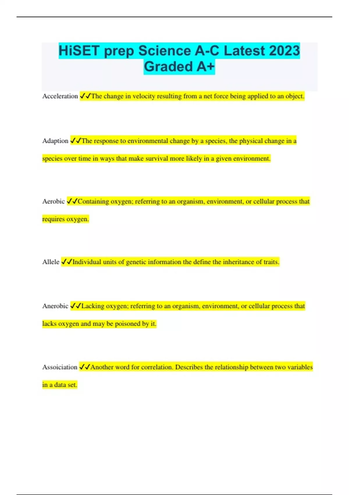 HiSET prep Science A-C Latest 2023 Graded A+ Acceleration The change in velocity resulting from a net force being applied to an object. Adaption The response to environmental change by a species, the physical change in a species over time in ways that make survival more likely in a given environment. Aerobic Containing oxygen; referring to an organism, environment, or cellular process that requires oxygen. Allele Individual units of genetic information the define the inheritance of traits. Anerobic Lacking oxygen; referring to an organism, environment, or cellular process that lacks oxygen and may be poisoned by it. Assoiciation Another word for correlation. Describes the relationship between two variables in a data set. Atom The fundamental unit that makes up the physical material-matter in our natural world. Atoms are made up of three particles: protons, neutrons and electrons. Protons and neutrons make up the nucleus of the atom, and the electrons orbit the nucleus in rings called shells. Protons have a positivie electrical charge. Neutron s have no elelctrical charge. Electrons have a negetive electrical charge. Atomic number The number of protons in an atom's nucleus. ATP A form of chemical energy used in cellular functions. Base A compound of DNA whose sequence on a strand defines the genetic code of an organism. Bases provide the mechanism fro two DNA strands to join together. Bias Accidental discrimination in experimental design that affects the quality of the results. Big Bang A theoretical giant explosion throught to have created the universe. Bonds Connections between atoms, used to form compounds and molecules. Carbon A chemical element. The symbol for carbon is C. Carbon dioxide A molecule consisting of 1 carbon and 2 oxygen atoms; a very important factor in global warming. Carnivore An animal that eats meat (other animals); often called a predator. Cause and Effect A relationship between two things in which one causes the other. Cell The basic unit supporting the structure and function of all living organism. some organisms consist of a single cell. Other organisms, like humans, animals, and plants, consist of many cells. Some cells (eukaryotic cells) have a well-defined central container (nucleus) of genetic material. Other cells (prokaryotic cells) do not have a nucleus. Cell Division The process that produces two cells from one parent cell. Cellular respiration A chemical reaction that takes place in the cell to release chemical energy from food. Chemical element a pure substance that consists entirely of one type of atom Chemical reaction A process that transforms energy from one form to another; for example, chemical bond energy becomes heat, or light becomes chemical bond energy. Chemical reactions must be balanced in terms of the number of atoms that enter and come out of the reaction. Chloroplast An organelle found in plant and algae cells where photosynthesis occurs Chromatin The material in the nucleus that contains the chromosomes. Chromosome A set of DNA molecules that define an organism's traits; the blueprint for the development of a new, variable cell. Circulatory system The system that includes the heart and blood vessels. It carries food, water, and oxygen to the cells and removes the waste products from cellular functions. cluster A group of points plotted close together on a scatter plot; indicates high probability. Consumer An animal that eats plants (herbivores). Continental Drift The movement of Earth's tectonic plates over long periods of time; responsible for the continents appearing like pieces of a puzzle. Control group The group is an experiment that is not exposed to the factor being tested. Controlled experiment An experiment with a control group and other design elements intended to reduce error and isolate the variable being tested. Core The inner portion of Earth; the planet's center. Correlation A relationships between two variables in a data set. Covalent bond A meoluclar bond in which two atoms share a pair of valence electrons. Crust The outer "skin" of Earth. Cup The customary unit of volume or capactiy