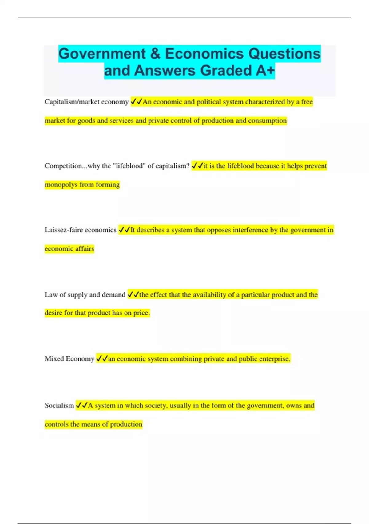 Government & Economics Questions and Answers Graded A+ Capitalism/market economy An economic and political system characterized by a free market for goods and services and private control of production and consumption Competition...why the "lifeblood" of capitalism? it is the lifeblood because it helps prevent monopolys from forming Laissez-faire economics It describes a system that opposes interference by the government in economic affairs Law of supply and demand the effect that the availability of a particular product and the desire for that product has on price. Mixed Economy an economic system combining private and public enterprise. Socialism A system in which society, usually in the form of the government, owns and controls the means of production Government "safety net" programs that help the people the fall through the cracks. (lost of job ext.) command economy An economic system in which the government controls a country's economy. Free Trade international trade left to its natural course without tariffs or other restrictions. Protectionism the theory or practice of shielding a country's domestic industries from foreign competition by taxing imports Tariffs a tax or duty to be paid on a particular class of imports or exports. NAFTA an agreement signed by Canada, Mexico, and the United States, that encourages free trade in North American countries is the central bank of the United States. It was founded by Congress in 1913 to provide the nation with a safer, more flexible, and more stable monetary and financial system Role of the Federal Reserve...why such a big part of the U.S. economy? was created in 1914, its purpose was to prevent unfair methods of competition in commerce as part of the battle to "bust the trusts." FTC (Federal Trade Commission)...when established (year)...initially why established by President Woodrow Wilson? Inflation a general increase in prices and fall in the purchasing value of money. 1970's "Stagflation" high inflation combined with high unemployment and stagnant demand in a country's economy. NYSE...Dow Jones Industrial Average? S & P 500? Bull Market a market in which share prices are rising, encouraging buying. Bear Market a market in which prices are falling, encouraging selling. Economic Depression a sustained, long-term downturn in economic activity in one or more economies Economic Recession a significant decline in economic activity spread across the economy, lasting more than a few months, normally visible in real GDP, real income, employment, industrial production, and wholesale-retail sales Balanced Budget a budget in which revenues are equal to expenditures National Debt the total amount of money that a country's government has borrowed, by various means Progressive Taxation is a tax in which the tax rate increases as the taxable amount increases Regressive Taxation is generally a tax that is applied uniformly. This means that it hits lower-income individuals harder. Social Security...what it is...how is it funded... any government system that provides monetary assistance to people with an lacking the quantity required or no income. Sherman Anti-Trust Act (1890) A federal law passed in 1890 that committed the American government to opposing monopolies. The law prohibits contracts, combinations, or conspiracies "in the restraint of trade or commerce." Clayton Anti-Trust Act (1914) an amendment passed by the U.S. Congress in 1914 that provides further clarification and substance to the Sherman Antitrust Act of 1890. As leader of America's central bank, the Federal Reserve, Yellen has immense influence over global financial markets and the U.S. economy. Trillions of dollars can be lost or gained based on how investors interpret each word that comes out of Yellen's mouth. Janet Yellen...why an important person? A monopoly is a business that's the only provider of a good or service. This gives it a tremendous competitive advantage over any other company that tries to provide a similar product. They can create inflation. Since they can set any price they want, they will raise costs to consumers. A Monopoly and why they endanger the economy? The Discount Rate the minimum interest rate set by the Federal Reserve for lending to other banks. Gross- Net Gross vs. Net pay aka...Where did my money go!? Pre-Tax Benefits
