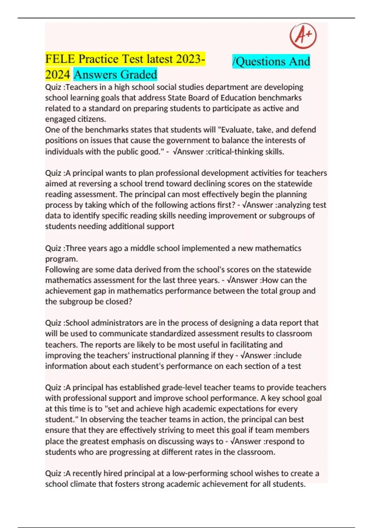 Quiz :Teachers in a high school social studies department are developing school learning goals that address State Board of Education benchmarks related to a standard on preparing students to participate as active and engaged citizens. One of the benchmarks states that students will "Evaluate, take, and defend positions on issues that cause the government to balance the interests of individuals with the public good." - √Answer :critical-thinking skills. Quiz :A principal wants to plan professional development activities for teachers aimed at reversing a school trend toward declining scores on the statewide reading assessment. The principal can most effectively begin the planning process by taking which of the following actions first? - √Answer :analyzing test data to identify specific reading skills needing improvement or subgroups of students needing additional support Quiz :Three years ago a middle school implemented a new mathematics program. Following are some data derived from the school's scores on the statewide mathematics assessment for the last three years. - √Answer :How can the achievement gap in mathematics performance between the total group and the subgroup be closed? Quiz :School administrators are in the process of designing a data report that will be used to communicate standardized assessment results to classroom teachers. The reports are likely to be most useful in facilitating and improving the teachers' instructional planning if they - √Answer :include information about each student's performance on each section of a test Quiz :A principal has established grade-level teacher teams to provide teachers with professional support and improve school performance. A key school goal at this time is to "set and achieve high academic expectations for every student." In observing the teacher teams in action, the principal can best ensure that they are effectively striving to meet this goal if team members place the greatest emphasis on discussing ways to - √Answer :respond to students who are progressing at different rates in the classroom. Quiz :A recently hired principal at a low-performing school wishes to create a school climate that fosters strong academic achievement for all students.