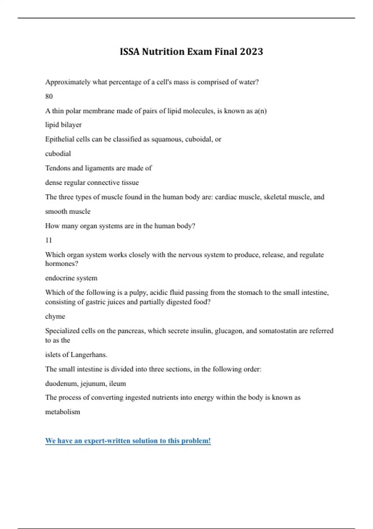 Approximately what percentage of a cell's mass is comprised of water? 80 A thin polar membrane made of pairs of lipid molecules, is known as a(n) lipid bilayer Epithelial cells can be classified as squamous, cuboidal, or cubodial Tendons and ligaments are made of dense regular connective tissue The three types of muscle found in the human body are: cardiac muscle, skeletal muscle, and smooth muscle How many organ systems are in the human body? 11 Which organ system works closely with the nervous system to produce, release, and regulate hormones? endocrine system Which of the following is a pulpy, acidic fluid passing from the stomach to the small intestine, consisting of gastric juices and partially digested food? chyme Specialized cells on the pancreas, which secrete insulin, glucagon, and somatostatin are referred to as the islets of Langerhans. The small intestine is divided into three sections, in the following order: duodenum, jejunum, ileum The process of converting ingested nutrients into energy within the body is known as metabolism We have an expert-written solution to this problem!calorie is the amount of energy needed to raise the temperature of 1 gram of water by 1° Celsius at a pressure of 1 atmosphere. What is the caloric (kcal) yield of nutritional fat? 9 kcal Which method of measuring energy expenditure measures oxygen consumed, and carbon dioxide produced? Indirect calorimetry Which of the following is widely used to predict an individual's resting metabolic rate (RMR)? Bland-Altman analysis Which of the following is a principle stating energy cannot be created or destroyed, but only changed from one form to another? Law of Conservation of Energy Within the ATP-ADP cycle, what is the process of adding a phosphate is called? rephosphorylation Which of the following is an enzyme catalyzing the breakdown of ATP to ADP? ATPase The phosphagen system provides an instant source of energy, for up to 30 seconds Which of the following fuel sources is the most effective at producing ATP? fatty acids Fructose produces a slower rise in blood sugar after consumption because It must be converted into glucose first Which of the following have glycemic index scores? carbs Which of the following is digested quickly in the body? monosacharides Which of the following is most likely to protect muscle from being catabolized during exercise? fruit