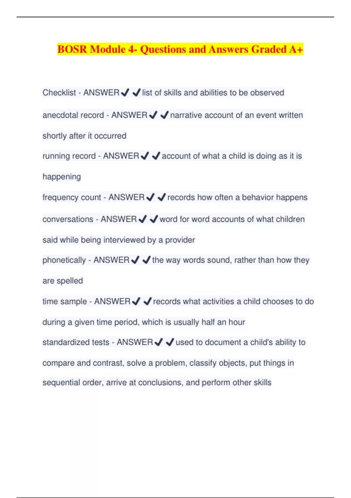 BOSR Module 4- Questions and Answers Graded A+ Checklist - ANSWER️️ list of skills and abilities to be observed anecdotal record - ANSWER️️ narrative account of an event written shortly after it occurred running record - ANSWER️️ account of what a child is doing as it is happening frequency count - ANSWER️️ records how often a behavio