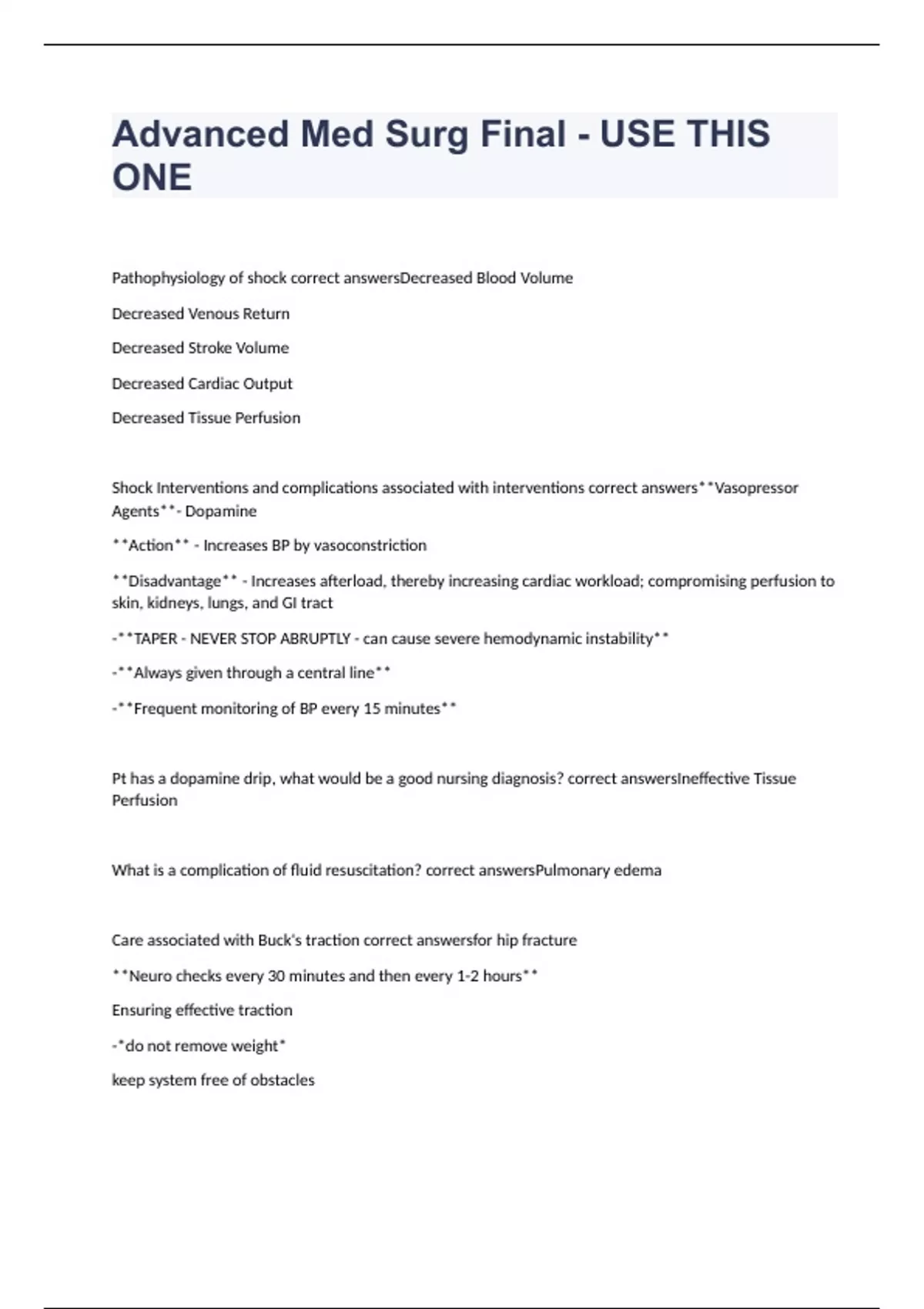 Pathophysiology of shock correct answersDecreased Blood Volume Decreased Venous Return Decreased Stroke Volume Decreased Cardiac Output Decreased Tissue Perfusion Shock Interventions and complications associated with interventions correct answers**Vasopressor Agents**- Dopamine **Action** - Increases BP by vasoconstriction **Disadvantage** - Increases afterload, thereby increasing cardiac workload; compromising perfusion to skin, kidneys, lungs, and GI tract -**TAPER - NEVER STOP ABRUPTLY - can cause severe hemodynamic instability** -**Always given through a central line** -**Frequent monitoring of BP every 15 minutes** Pt has a dopamine drip, what would be a good nursing diagnosis? correct answersIneffective Tissue Perfusion What is a complication of fluid resuscitation? correct answersPulmonary edema Care associated with Buck's traction correct answersfor hip fracture **Neuro checks every 30 minutes and then every 1-2 hours** Ensuring effective traction -*do not remove weight* keep system free of obstacles