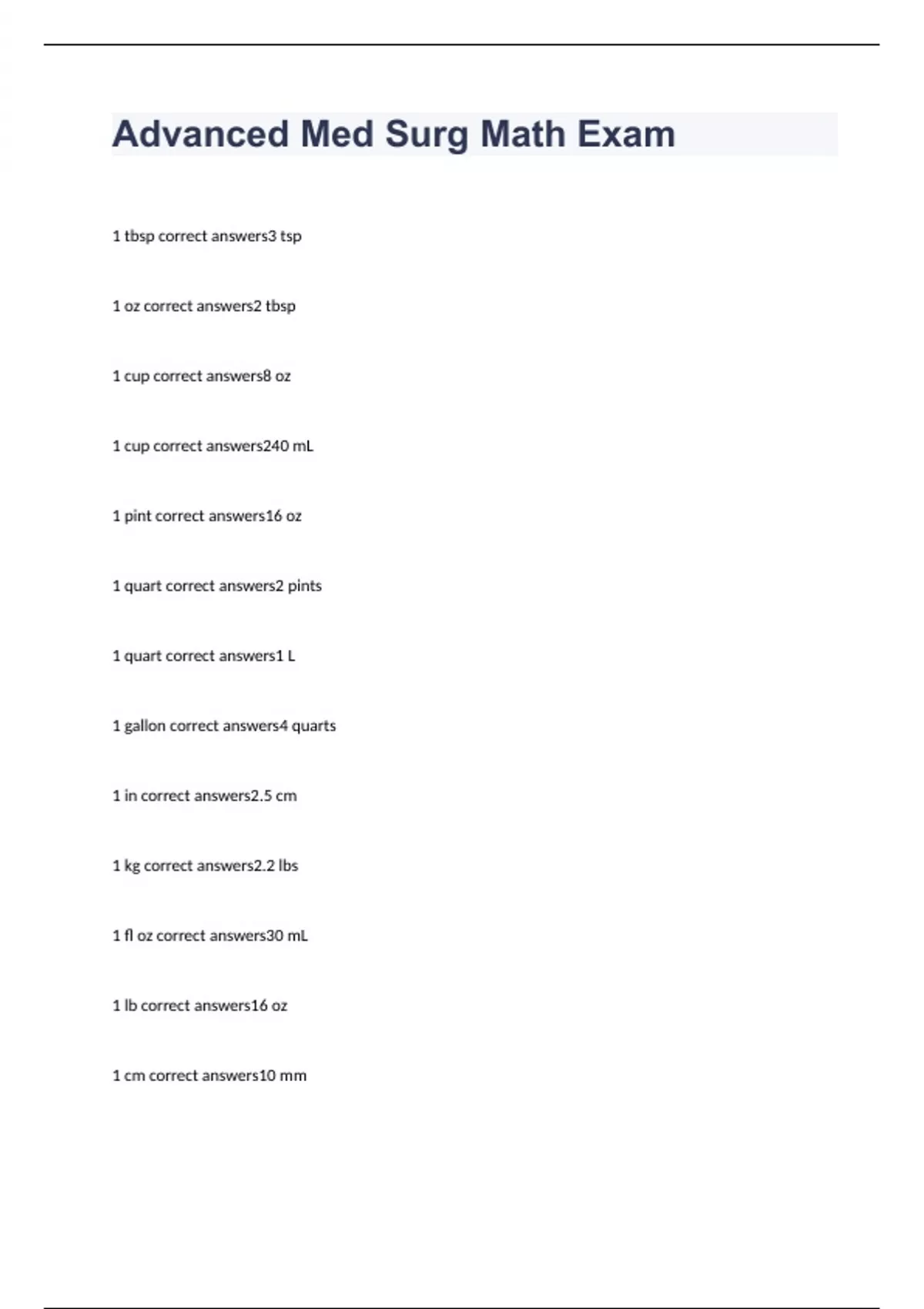 1 tbsp correct answers3 tsp 1 oz correct answers2 tbsp 1 cup correct answers8 oz 1 cup correct answers240 mL 1 pint correct answers16 oz 1 quart correct answers2 pints 1 quart correct answers1 L 1 gallon correct answers4 quarts 1 in correct answers2.5 cm 1 kg correct answers2.2 lbs 1 fl oz correct answers30 mL 1 lb correct answers16 oz 1 cm correct answers10 mm