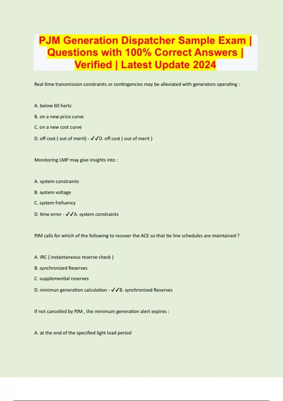 PJM Generation Dispatcher Sample Exam | Questions with 100% Correct Answers | Verified | Latest Update 2024