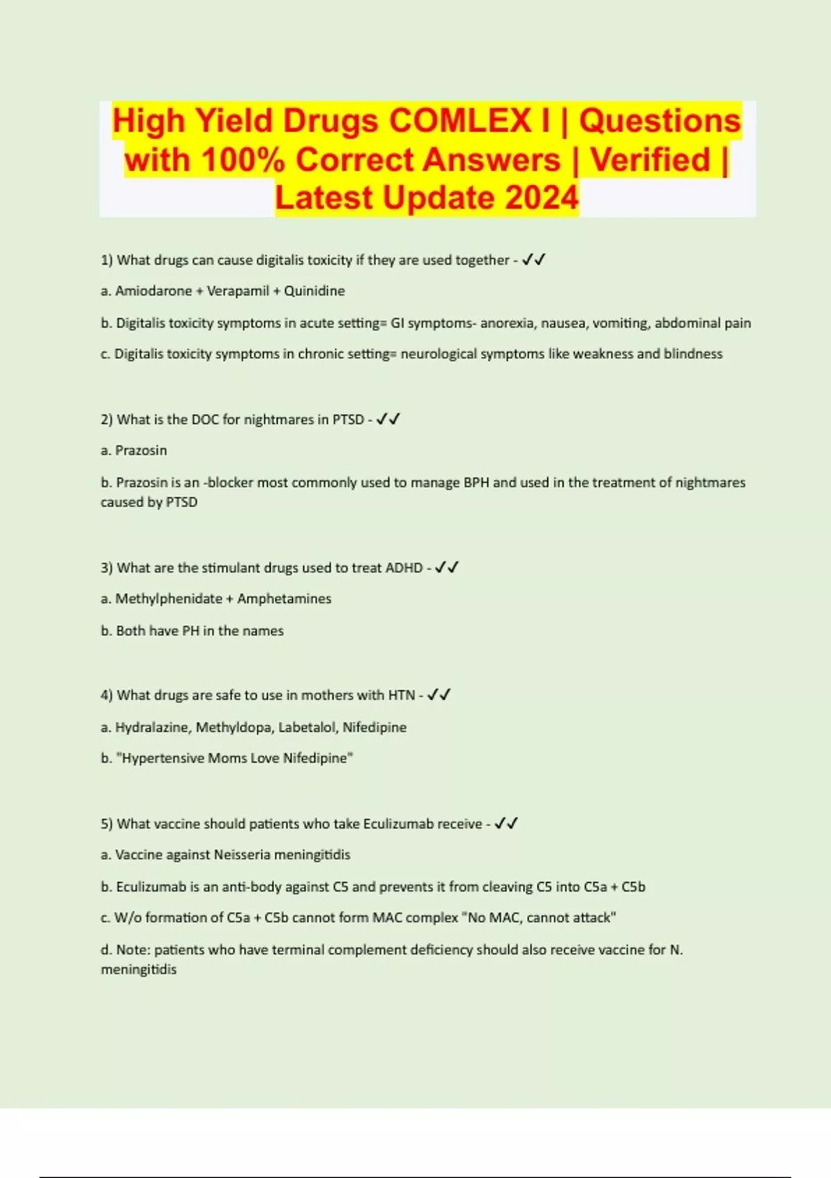 1) What drugs can cause digitalis toxicity if they are used together - a. Amiodarone + Verapamil + Quinidine b. Digitalis toxicity symptoms in acute setting= GI symptoms- anorexia, nausea, vomiting, abdominal pain c. Digitalis toxicity symptoms in chronic setting= neurological symptoms like weakness and blindness 2) What is the DOC for nightmares in PTSD - a. Prazosin b. Prazosin is an -blocker most commonly used to manage BPH and used in the treatment of nightmares caused by PTSD 3) What are the stimulant drugs used to treat ADHD - a. Methylphenidate + Amphetamines b. Both have PH in the names 4) What drugs are safe to use in mothers with HTN - a. Hydralazine, Methyldopa, Labetalol, Nifedipine b. "Hypertensive Moms Love Nifedipine" 5) What vaccine should patients who take Eculizumab receive