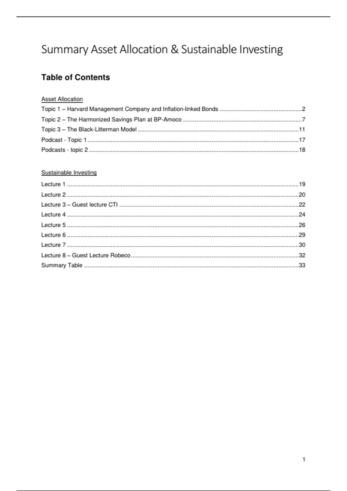 Complete summary of Asset Allocation and Sustainable Investing taught by Lieven Bale and Jac Kragt . It containts a summary of all lectures, guest-lectures, mandatory podcasts and videos.