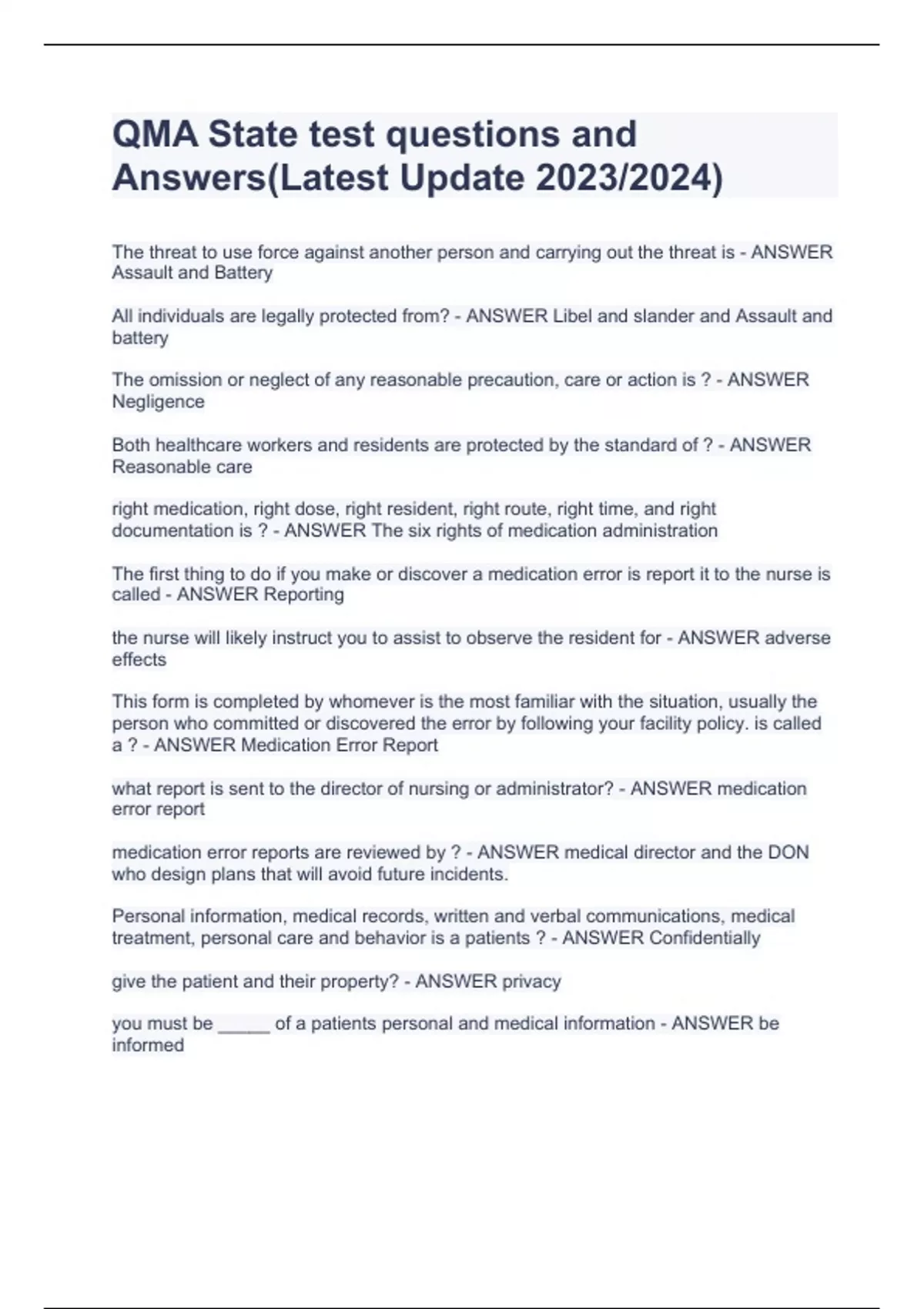 QMA State test questions an The threat to use force against another person and carrying out the threat is - ANSWER Assault and Battery All individuals are legally protected from? - ANSWER Libel and slander and Assault and battery The omission or neglect of any reasonable precaution, care or action is ? - ANSWER Negligence Both healthcare workers and residents are protected by the standard of ? - ANSWER Reasonable care right medication, right dose, right resident, right route, right time, and right documentation is ? - ANSWER The six rights of medication administration The first thing to do if you make or discover a medication error is report it to the nurse is called - ANSWER Reporting d Answers(Latest Update 2023/2024)