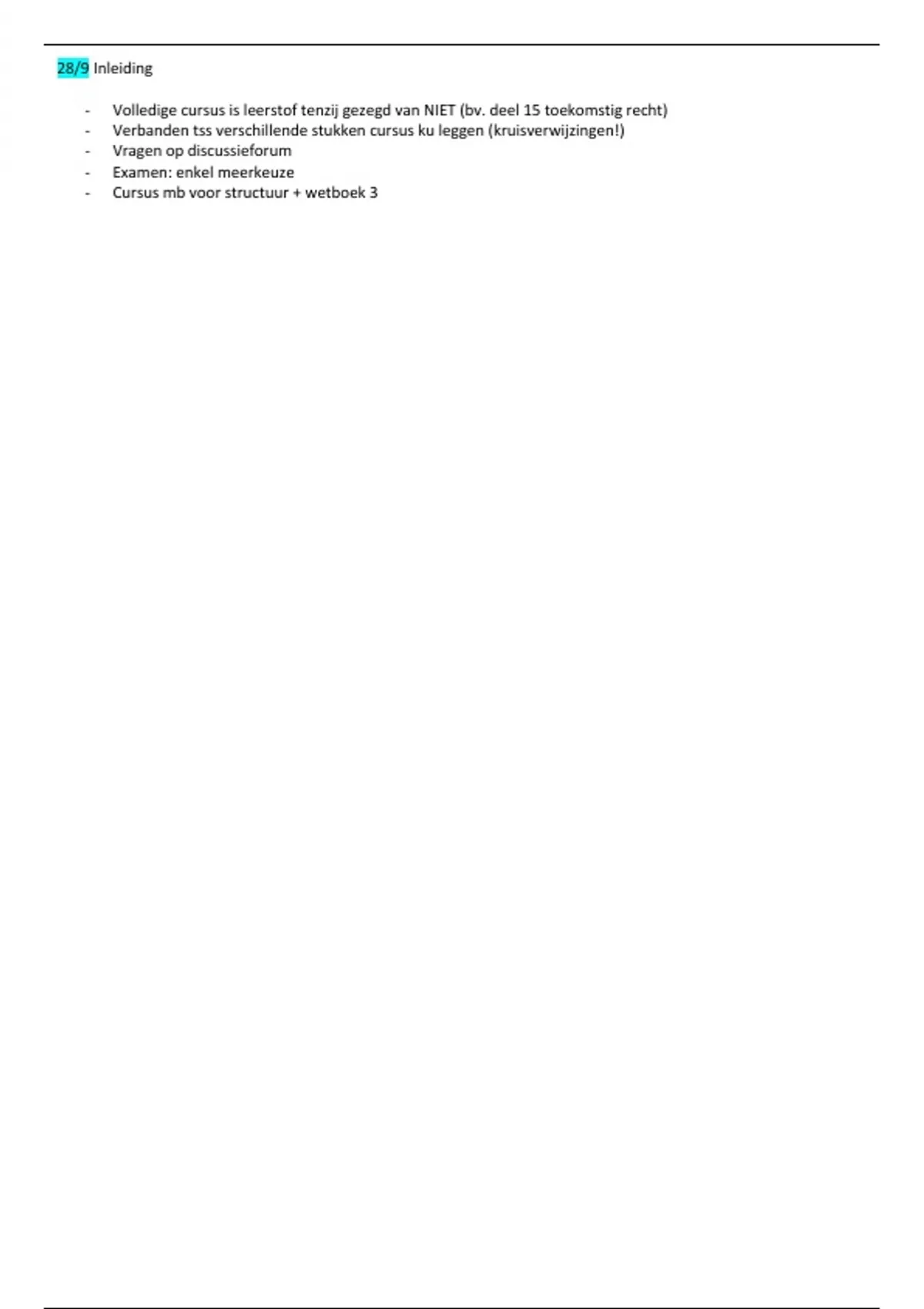 - Volledige cursus is leerstof tenzij gezegd van NIET (bv. deel 15 toekomstig recht)