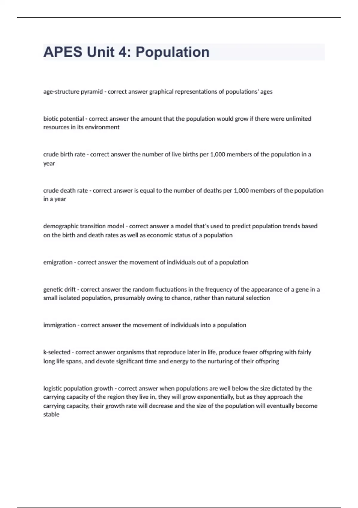 APES Unit 4 Population Question and answers already passed 2023/2024 age-structure pyramid - correct answer graphical representations of populations' ages biotic potential - correct answer the amount that the population would grow if there were unlimited resources in its environment crude birth rate - correct answer the number of live births per 1,000 members of the population in a year crude death rate - correct answer is equal to the number of deaths per 1,000 members of the population in a year demographic transition model - correct answer a model that's used to predict population trends based on the birth and death rates as well as economic status of a population emigration - correc