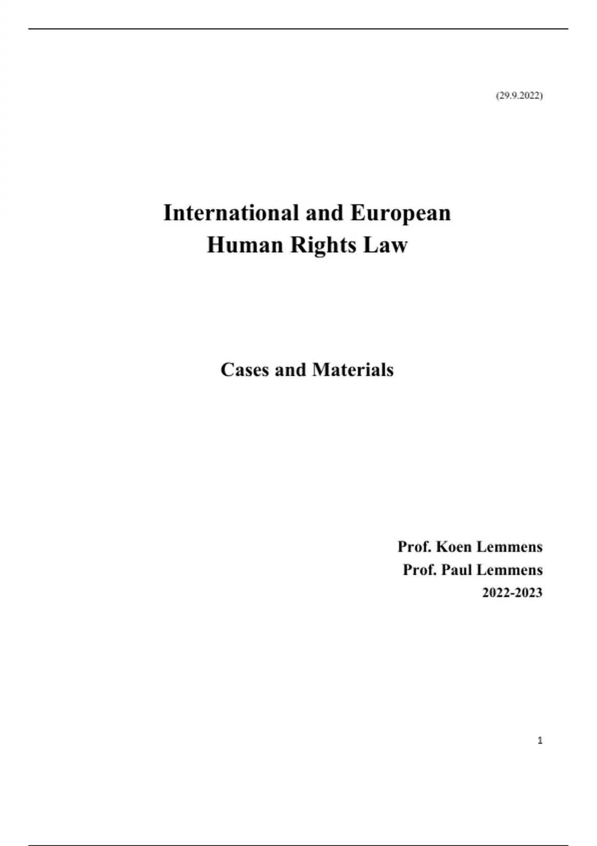 Complete summary of the third bachelor's course in International and European Human Rights Law in the Bachelor of Law, KU Leuven taught by Prof. P. Lemmens of both all classes and powerpoints. All texts are also included at the end of each chapter. The PDF document has already been made print-friendly because all new parts start on new pages. The summary was created in 2023.
