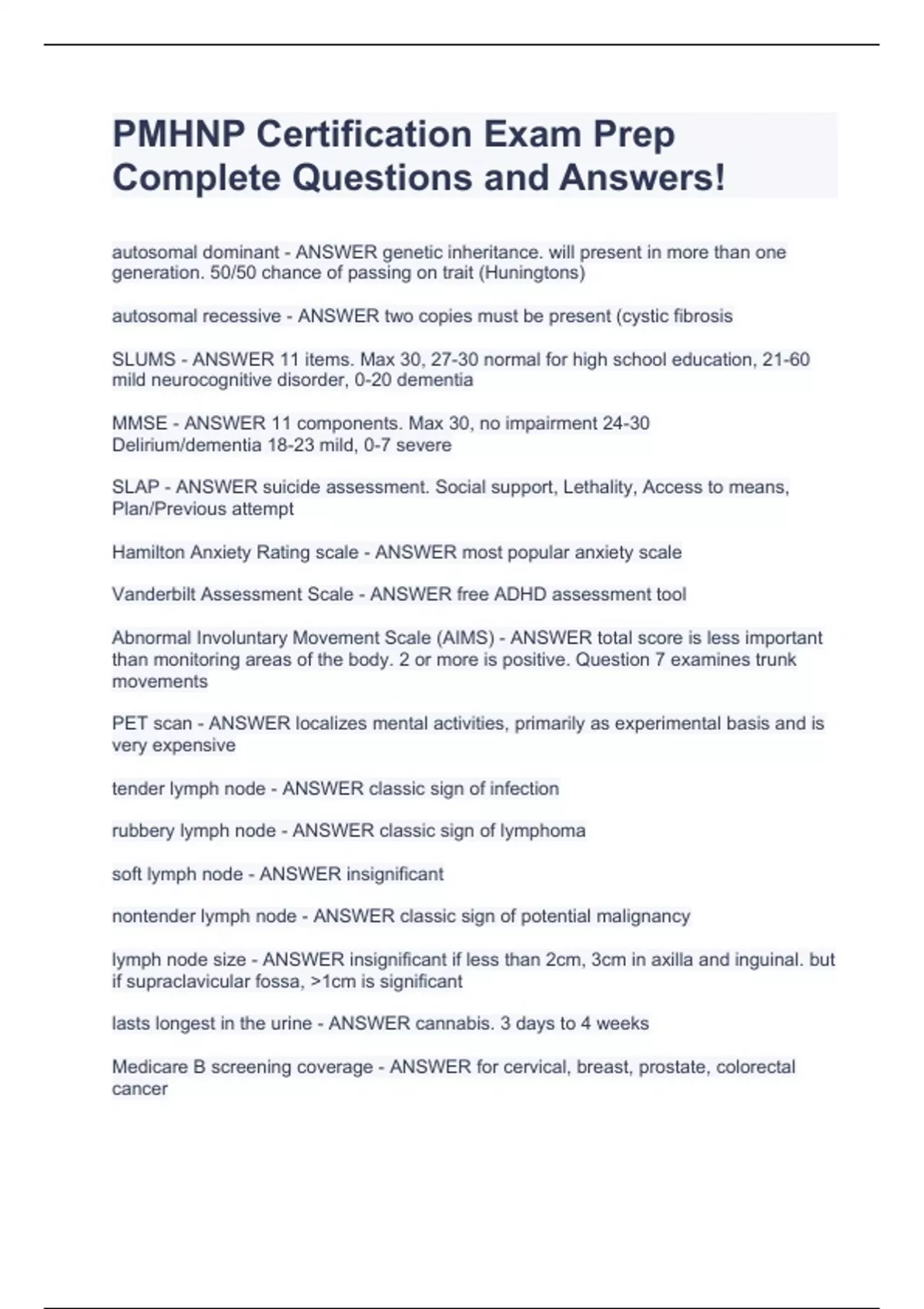 PMHNP Certification Exam Prep Complete autosomal dominant - ANSWER genetic inheritance. will present in more than one generation. 50/50 chance of passing on trait (Huningtons) autosomal recessive - ANSWER two copies must be present (cystic fibrosis SLUMS - ANSWER 11 items. Max 30, 27-30 normal for high school education, 21-60 mild neurocognitive disorder, 0-20 dementia MMSE - ANSWER 11 components. Max 30, no impairment 24-30 Delirium/dementia 18-23 mild, 0-7 severe SLAP - ANSWER suicide assessment. Social support, Lethality, Access to means, Plan/Previous attempt Hamilton Anxiety Rating scale - ANSWER most popular anxiety scale Vanderbilt Assessment Scale - ANSWER free ADHD assessment tool Abnormal Involuntary Movement Scale (AIMS) - ANSWER total score is less important than monitoring areas of the body. 2 or more is positive. Question 7 examines trunk movements PET scan - ANSWER localizes mental activities, primarily as experimental basis and is very expensive tender lymph node - ANSWER classic sign of infection rubbery lymph node - ANSWER classic sign of lymphoma soft lymph node - ANSWER insignificant nontender lymph node - ANSWER classic sign of potential malignancy lymph node size - ANSWER insignificant if less than 2cm, 3cm in axilla and inguinal. but if supraclavicular fossa, >1cm is significant lasts longest in the urine - ANSWER cannabis. 3 days to 4 weeks Medicare B screening coverage - ANSWER for cervical, breast, prostate, colorectal cancer top 4 killers of adults in US - ANSWER heart disease, cancer, lower resp disease, CVA lung cancer - ANSWER highest cancer mortality in women and men, primary prevention - ANSWER PROMOTES health PRIOR. healthy diet, exercise, avoiding things secondary prevention - ANSWER focuses on early identification and treatment of e Questions and Answers!