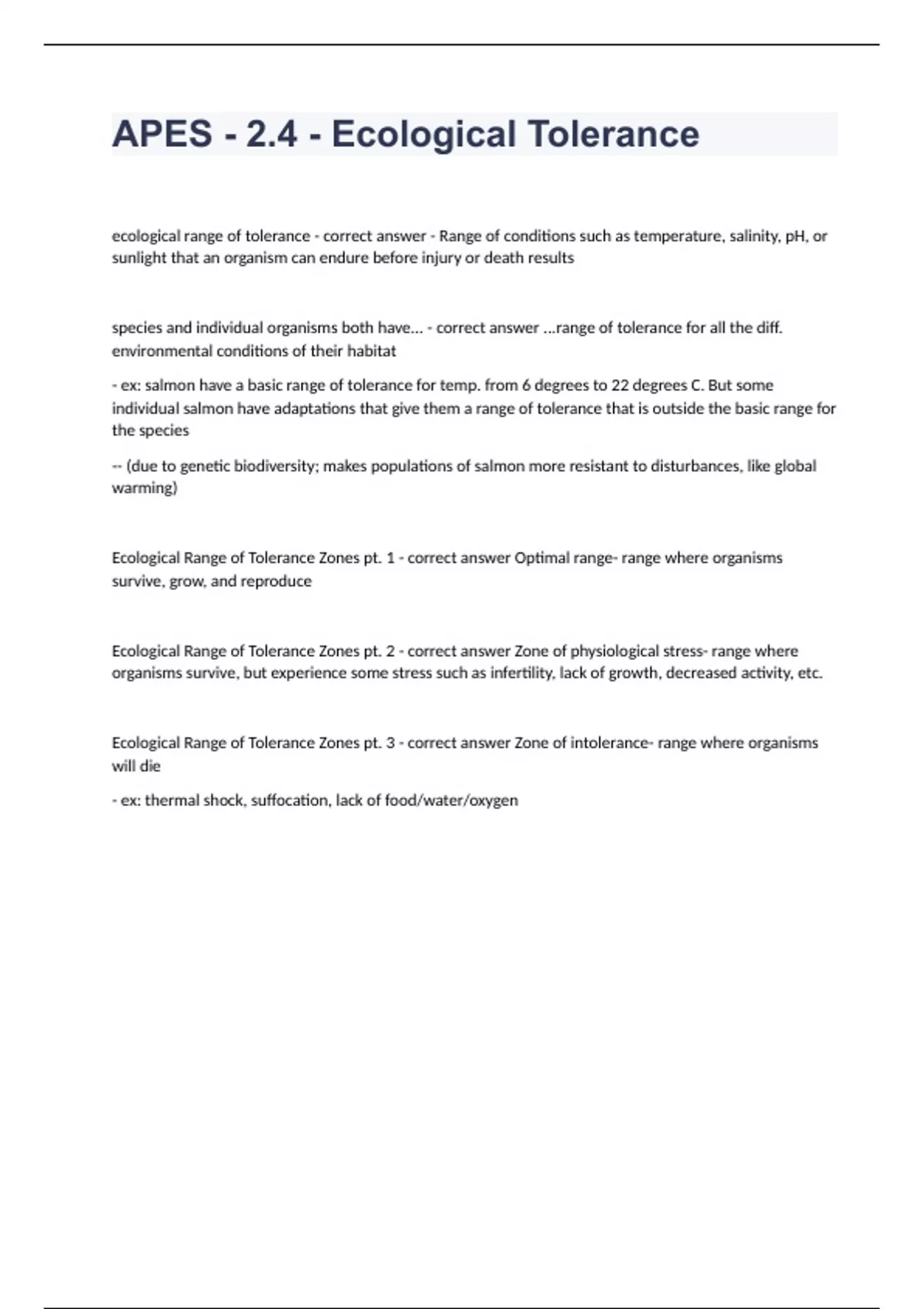 APES - 2.4 - Ecological Tolerance Question and answers rated A+ 2023/2024ecological range of tolerance - correct answer - Range of conditions such as temperature, salinity, pH, or sunlight that an organism can endure before injury or death results species and individual organisms both have... - correct answer ...range of tolerance for all the diff. environmental conditions of their habitat - ex: salmon have a basic range of tolerance for temp. from 6 degrees to 22 degrees C. But some individual salmon have adaptations that give them a range of tolerance that is outside the basic range for the species -- (due to genetic biodiversity; makes populations of salmon more resistant to disturbances, like global warming) Ecological Range of Tolerance Zones pt. 1 - correct answer Optimal range- range where organisms survive, grow, and reproduce Ecological Range of Tolerance Zones pt. 2 - correct answer Zone of physiological stress- range where organisms survive, b