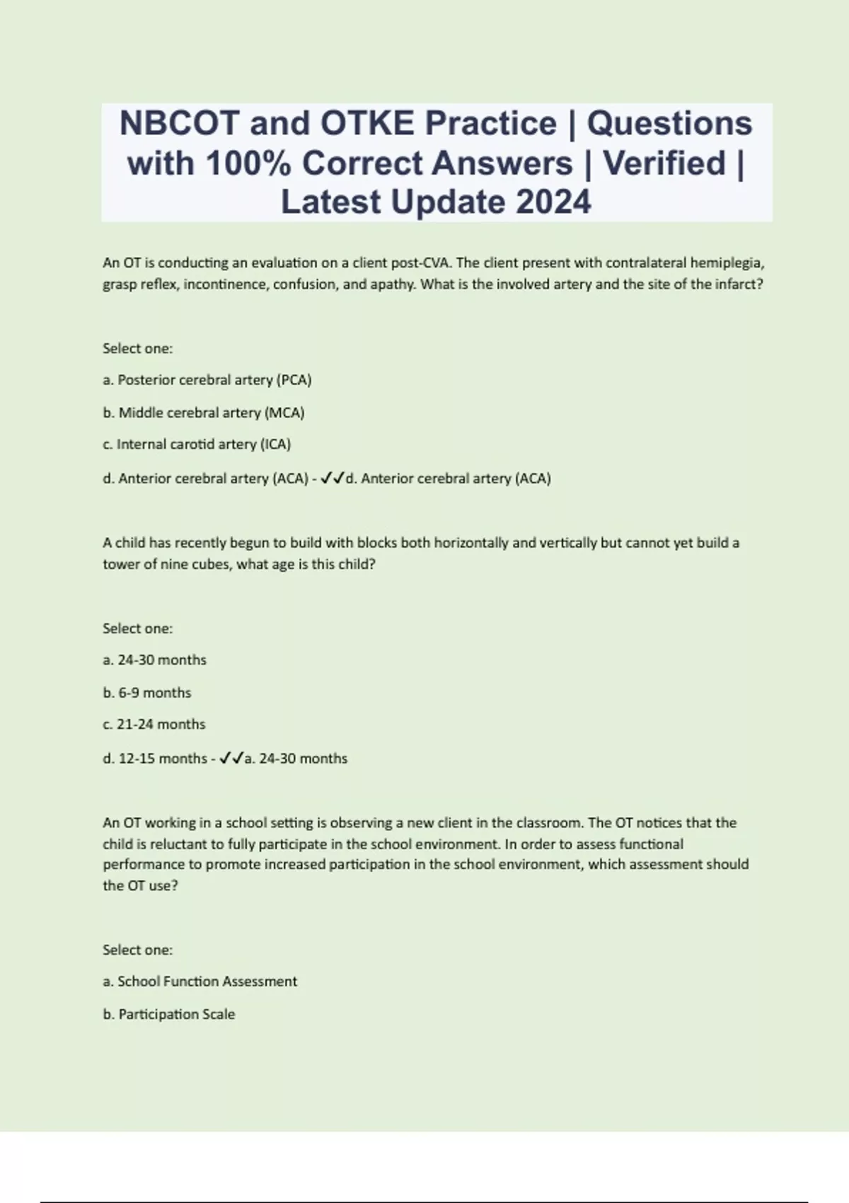 An OT is conducting an evaluation on a client post-CVA. The client present with contralateral hemiplegia, grasp reflex, incontinence, confusion, and apathy. What is the involved artery and the site of the infarct? Select one: a. Posterior cerebral artery (PCA) b. Middle cerebral artery (MCA) c. Internal carotid artery (ICA) d. Anterior cerebral artery (ACA) - d. Anterior cerebral artery (ACA) A child has recently begun to build with blocks both horizontally and vertically but cannot yet build a tower of nine cubes, what age is this child? Select one: a. 24-30 months b. 6-9 months c. 21-24 months d. 12-15 months - a. 24-30 months An OT working in a school setting is observing a new client in the classroom. The OT notices that the child is reluctant to fully participate in the school environment. In order to assess functional performance to promote increased participation in the school environment, which assessment should the OT use? Select one: a. School Function Assessment b. Participation Scale