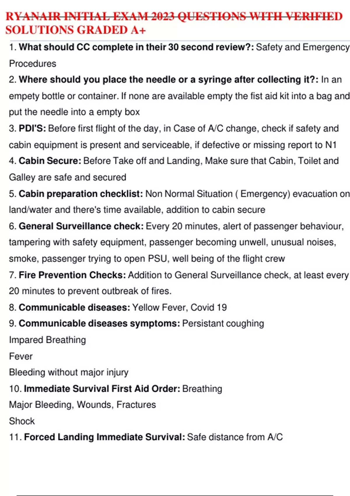 1. What should CC complete in their 30 second review?: Safety and Emergency Procedures 2. Where should you place the needle or a syringe after collecting it?: In an empety bottle or container. If none are available empty the fist aid kit into a bag and put the needle into a empty box 3. PDI'S: Before first flight of the day, in Case of A/C change, check if safety and cabin equipment is present and serviceable, if defective or missing report to N1 4. Cabin Secure: Before Take off and Landing, Make sure that Cabin, Toilet and Galley are safe and secured 5. Cabin preparation checklist: Non Normal Situation ( Emergency) evacuation on land/water and there's time available, addition to cabin secure 6. General Surveillance check: Every 20 minutes, alert of passenger behaviour, tampering with safety equipment, passenger becoming unwell, unusual noises, smoke, passenger trying to open PSU, well being of the flight crew 7. Fire Prevention Checks: Addition to General Surveillance check, at least every 20 minutes to prevent outbreak of fires. 8. Communicable diseases: Yellow Fever, Covid 19 9. Communicable diseases symptoms: Persistant coughing Impared Breathing Fever Bleeding without major injury 10. Immediate Survival First Aid Order: Breathing Major Bleeding, Wounds, Fractures Shock 11. Forced Landing Immediate Survival: Safe distance from A/C