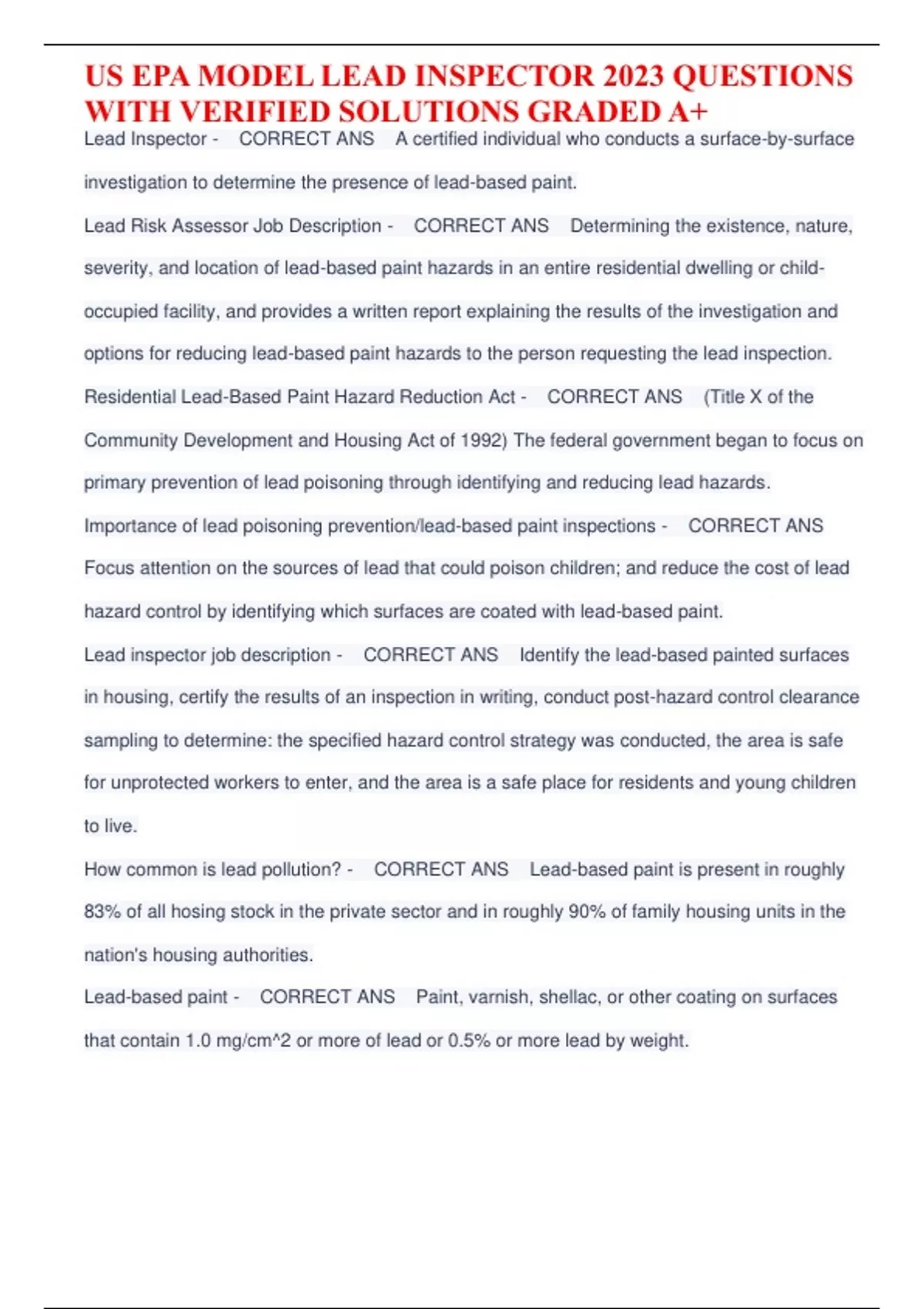 Lead Inspector - CORRECT ANS A certified individual who conducts a surface-by-surface investigation to determine the presence of lead-based paint. Lead Risk Assessor Job Description - CORRECT ANS Determining the existence, nature, severity, and location of lead-based paint hazards in an entire residential dwelling or childoccupied facility, and provides a written report explaining the results of the investigation and options for reducing lead-based paint hazards to the person requesting the lead inspection. Residential Lead-Based Paint Hazard Reduction Act - CORRECT ANS (Title X of the Community Development and Housing Act of 1992) The federal government began to focus on primary prevention of lead poisoning through identifying and reducing lead hazards. Importance of lead poisoning prevention/lead-based paint inspections - CORRECT ANS Focus attention on the sources of lead that could poison children; and reduce the cost of lead hazard control by identifying which surfaces are coated with lead-based paint. Lead inspector job description - CORRECT ANS Identify the lead-based painted surfaces in housing, certify the results of an inspection in writing, conduct post-hazard control clearance sampling to determine: the specified hazard control strategy was conducted, the area is safe for unprotected workers to enter, and the area is a safe place for residents and young children to live. How common is lead pollution? - CORRECT ANS Lead-based paint is present in roughly 83% of all hosing stock in the private sector and in roughly 90% of family housing units in the nation's housing authorities. Lead-based paint - CORRECT ANS Paint, varnish, shellac, or other coating on surfaces that contain 1.0 mg/cm^2 or more of lead or 0.5% or more lead by weight