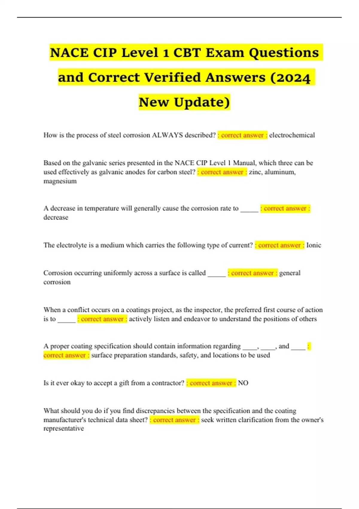 NACE CIP Level 1 CBT Exam Questions and Correct Verified Answers (2024 New Update) How is the process of steel corrosion ALWAYS described? : correct answer : electrochemical Based on the galvanic series presented in the NACE CIP Level 1 Manual, which three can be used effectively as galvanic anodes for carbon steel? : correct answer : zinc, aluminum, magnesium A decrease in temperature will generally cause the corrosion rate to _____ : correct answer : decrease The electrolyte is a medium which carries the following type of current? : correct answer : Ionic Corrosion occurring uniformly across a surface is called _____ : correct answer : general corrosion