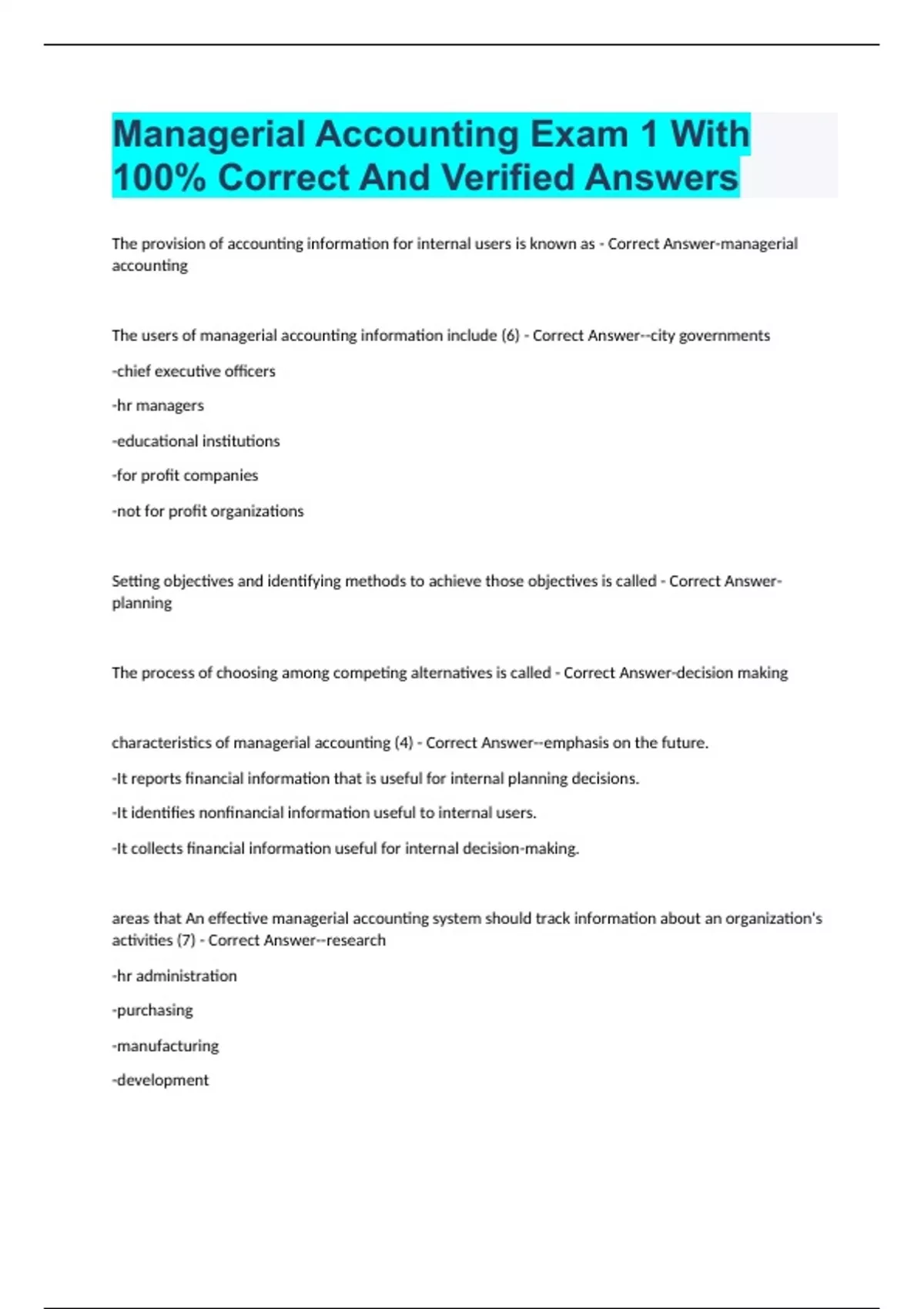 Managerial Accounting Exam 1 With 100% Correct And Verified Answers