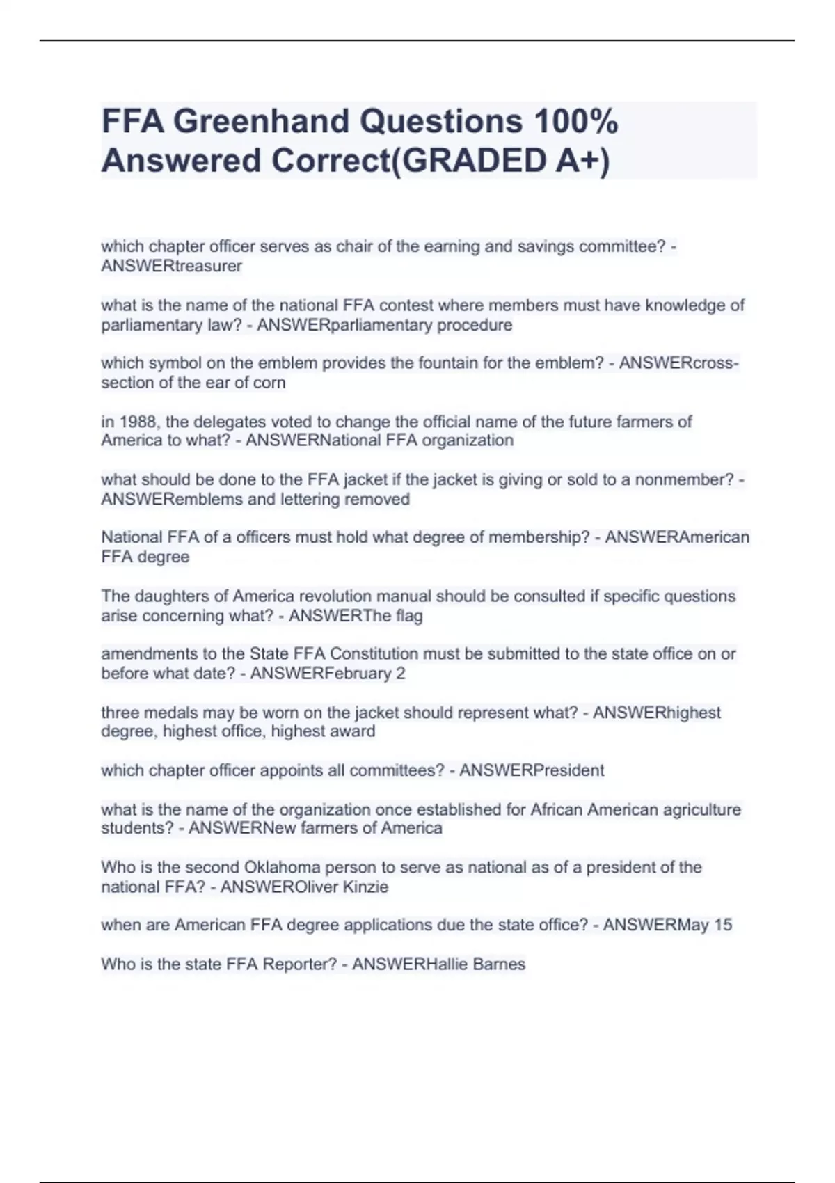 ffa greenhand questions stuvia2023