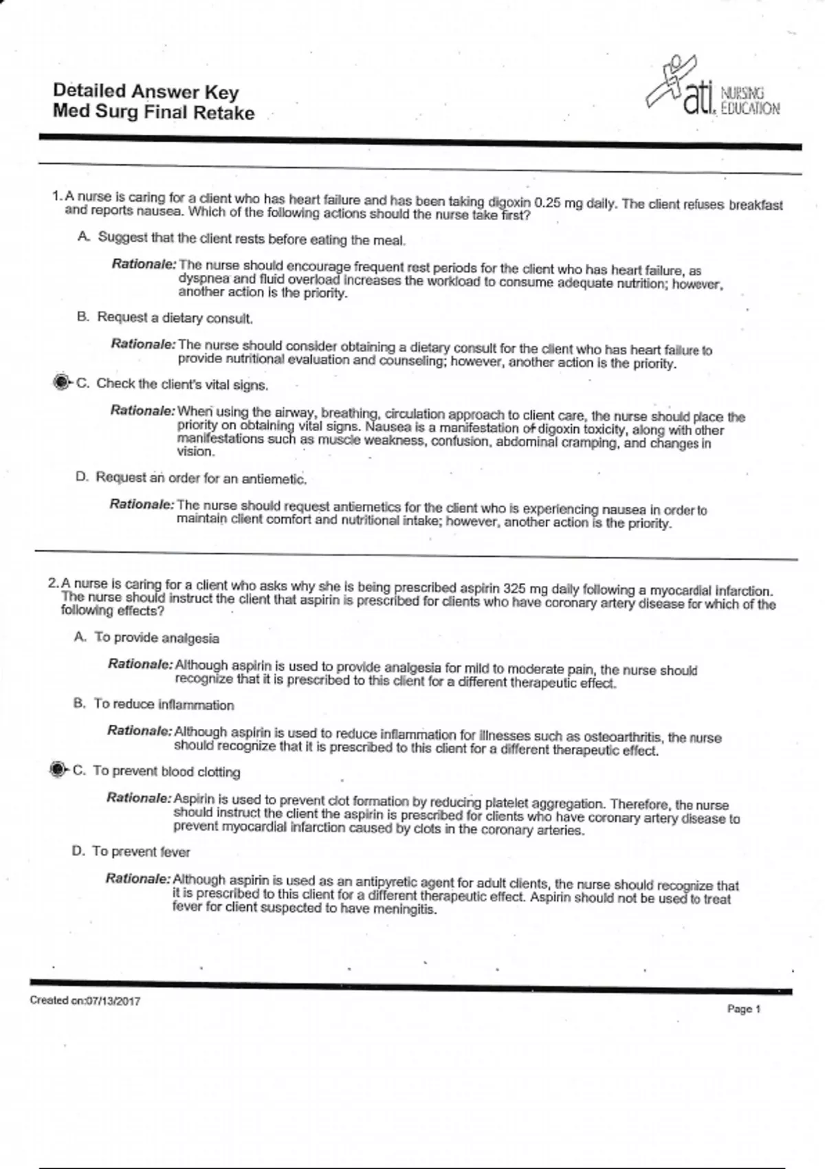 ATI MED SURGE FINAL EXAM RETAKE ANSWER KEY 2023 VERSION 1 GRADED A+