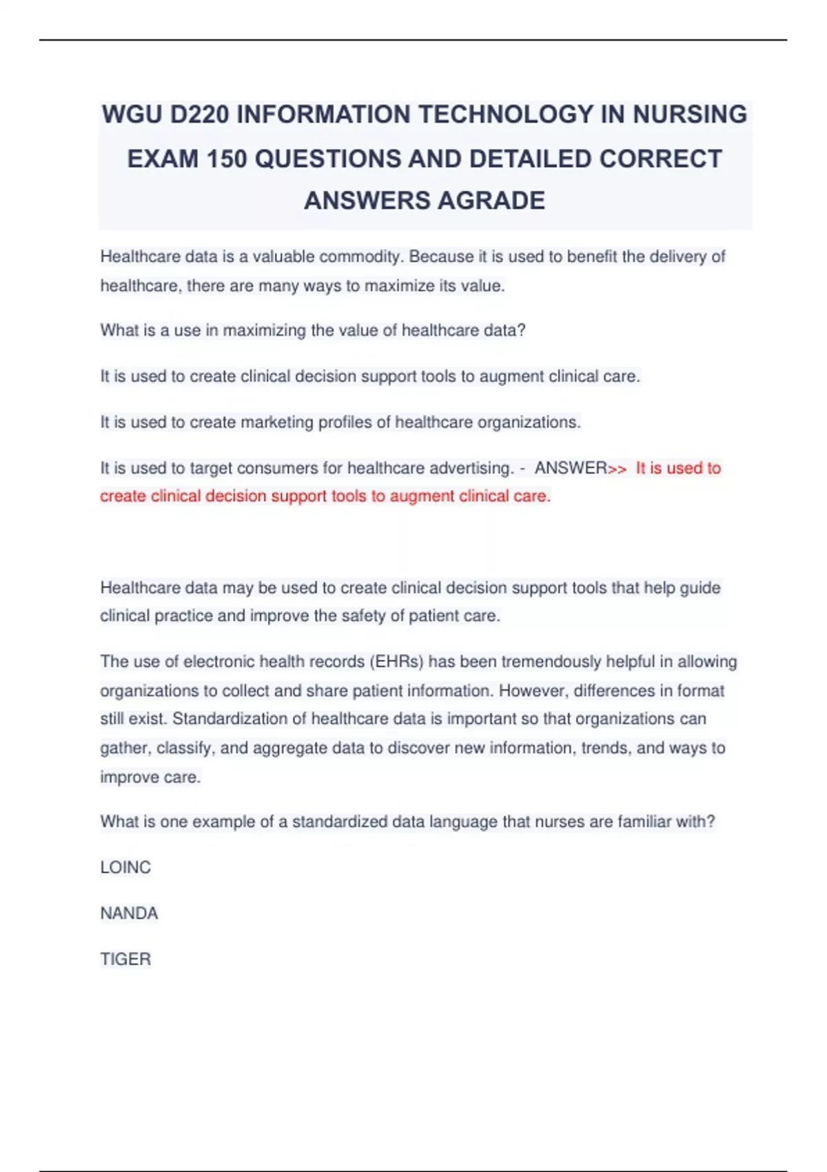 WGU D220 INFORMATION TECHNOLOGY IN NURSING EXAM 150 QUESTIONS AND DETAILED CORRECT ANSWERS AGRADE