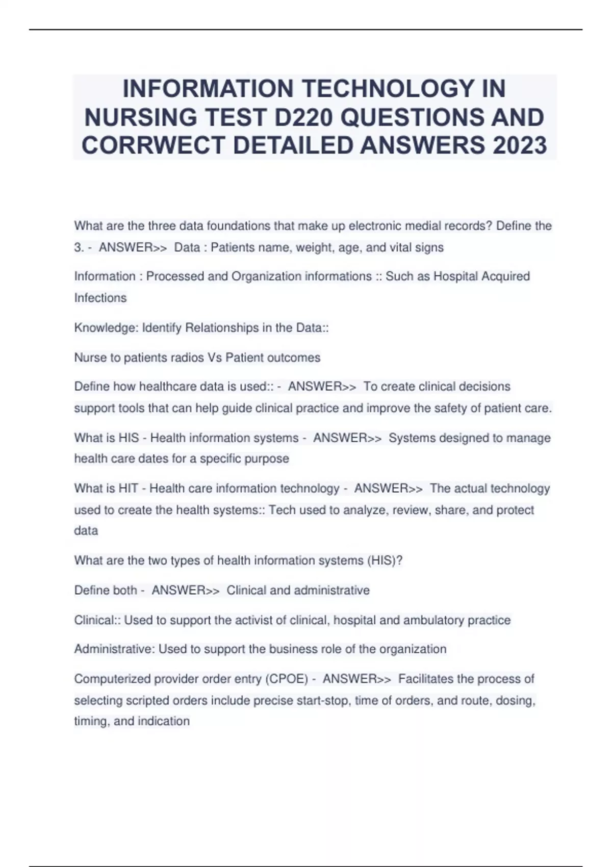 INFORMATION TECHNOLOGY IN NURSING TEST D220 QUESTIONS AND CORRECT DETAILED ANSWERS AGRADE