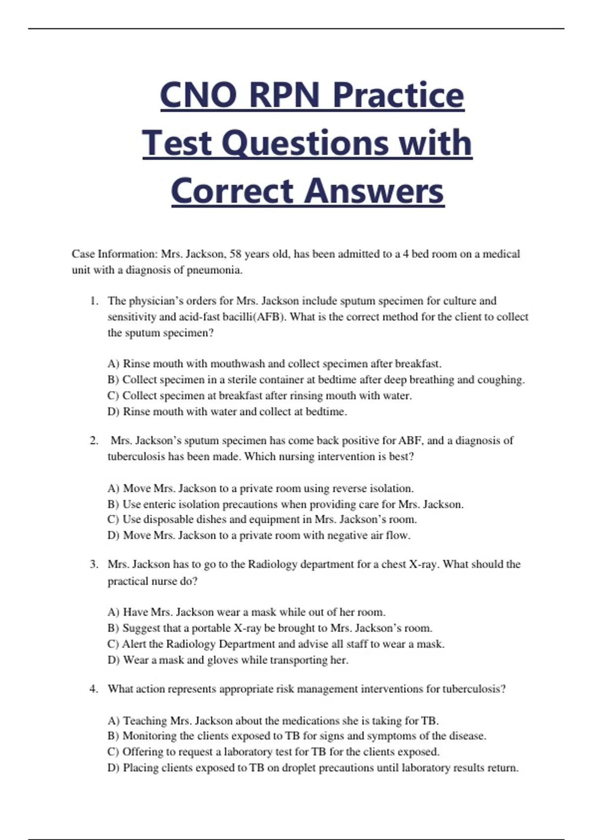 CNO RPN Practice Test Questions with Correct Answers Case Information: Mrs. Jackson, 58 years old, has been admitted to a 4 bed room on a medical unit with a diagnosis of pneumonia. 1. The physician’s orders for Mrs. Jackson include sputum specimen for culture and sensitivity and acid-fast bacilli(AFB). What is the correct method for the client to collect the sputum specimen? A) Rinse mouth with mouthwash and collect specimen after breakfast. B) Collect specimen in a sterile container at bedtime after deep breathing and coughing. C) Collect specimen at breakfast after rinsing mouth with water. D) Rinse mouth with water and collect at bedtime. 2. Mrs. Jackson’s sputum specimen has come back positive for ABF, and a diagnosis of tuberculosis has been made. Which nursing intervention is best? A) Move Mrs. Jackson to a private room using reverse isolation. B) Use enteric isolation precautions when providing care for Mrs. Jackson. C) Use disposable dishes and equipment in Mrs. Jackson’s room. D) Move Mrs. Jackson to a private room with negative air flow. 3. Mrs. Jackson has to go to the Radiology department for a chest X-ray. What should the practical nurse do? A) Have Mrs. Jackson wear a mask while out of her room. B) Suggest that a portable X-ray be brought to Mrs. Jackson’s room. C) Alert the Radiology Department and advise all staff to wear a mask. D) Wear a mask and gloves while transporting her.