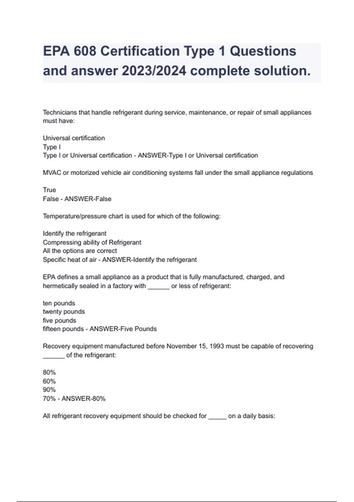 EPA 608 Certification Type 1 Questions and answer 2023/2024 complete solution.