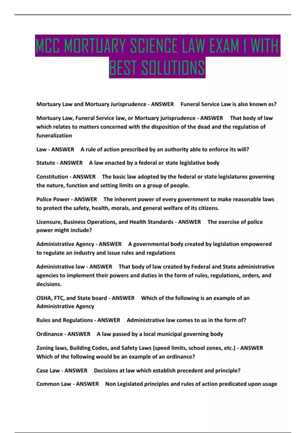 MCC MORTUARY SCIENCE LAW EXAM 1 WITH BEST SOLUTIONS Mortuary Law and Mortuary Jurisprudence - ANSWER Funeral Service Law is also known as? Mortuary Law, Funeral Service law, or Mortuary jurisprudence - ANSWER That body of law which relates to matters concerned with the disposition of the dead and the regulation of funeralization Law - ANSWER A rule of action prescribed by an authority able to enforce its will? Statute - ANSWER A law enacted by a federal or state legislative body Constitution - ANSWER The basic law adopted by the federal or state legislatures governing the nature, function and setting limits on a group of people. Police Power - ANSWER The inherent power of every government to make reasonable laws to protect the safety, health, morals, and general welfare of its citizens. Licensure, Business Operations, and Health Standards - ANSWER The exercise of police power might include? Administrative Agency - ANSWER A governmental body created by legislation empowered to regulate an industry and issue rules and regulations Administrative law - ANSWER That body of law created by Federal and State administrative agencies to implement their powers and duties in the form of rules, regulations, orders, and decisions. OSHA, FTC, and State board - ANSWER Which of the following is an example of an Administrative Agency Rules and Regulations - ANSWER Administrative law comes to us in the form of? Ordinance - ANSWER A law passed by a local municipal governing body Zoning laws, Building Codes, and Safety Laws (speed limits, school zones, etc.) - ANSWER Which of the following would be an example of an ordinance? Case Law - ANSWER Decisions at law which establish precedent and principle? Common Law - ANSWER Non Legislated principles and rules of action predicated upon usage and custom Common Law - ANSWER Unwritten Law also known as? Corpse - ANSWER Dead human body at law? Dead human body-corpse - ANSWER The body of a dead human being, deprived of life, but not yet entirely disintegrated (varies among the several states) Death - ANSWER The total and irreversible cessation of all metabolic activity Death - ANSWER The cessation of life Death - ANSWER A permanent cessation of all vital functions and signs Ecclesiastical law - ANSWER Historically, the no property theory was held by because in England at that time the body was considered to be the property of the church. Quasi-Property Theory - ANSWER The currently accepted view of the property and property rights in a dead human body in the United States is the? Quasi-Property Theory - ANSWER Rights associated with the dead body are as if it were property for the purpose of disposition only Injunction - ANSWER The two elements necessary for property All of these - ANSWER Which of the following are means of final disposition: 1-interment, 2-burial at sea, 3-entombment, 4-cremation, 5-donation. Final disposition - ANSWER The conclusive act of service with respect to the dead human body Uniform Anatomical Gift Act - ANSWER A law permitting a person of legal age and sound mind to give all or any part of his body to take effect upon his death or gives the right to another Injunction - ANSWER A court order forbidding a person from doing a certain act Replevin - ANSWER Action to recover through the court an item or its value that has been wrongfully detained or altered form its original condition Body part - ANSWER In the Uniform Anatomical Gift Act- an organ, tissue, eye, body, artery, blood, other fluids and other portions of a human body for transplantation. All of these - ANSWER Which of the following play a part in the requirements for decent burial/final disposition: 1-community standards, 2-wishes of decedent, 3-wishes of survivors, 4-public interest, 5-statutes. All of these - ANSWER Which of the following are those that receive the primary duty of decent burial: 1-house holder, 2-surviving spouse, 3-next of kin, 4-public authorities. Duty - ANSWER Obligatory tasks, conduct, service, or function that arise from one's position in life. 2, 4, 6, 5, 3, 1 - ANSWER Primary right of final disposition (put in the proper order) 1-Volunteer 2-Decedent's Wishes 3-Decedent's Guardian 4-Personal representative 6-Next of kin Pre-arrangements, Will or other documents, or other declarations by the decedant - ANSWER The decedent's wishes may be discovered from? A divorced spouse is not a surviving spouse and has no say in disposition - ANSWER Effect of divorce on the right of the surviving spouse? Still the surviving spouse - ANSWER Surviving spouse (separation or estrangement) 2, 1, 3 - ANSWER Next of kin (degree of kindred)- 1-Parents 2-Adult children 3-Brother and sisters Guardian - ANSWER A judicial appointment of a person to administer the affairs of another person who is incompetent by virtue of age or legal disability: State, County, or Local Government - ANSWER The secondary right of disposition usually lies with the? Actual Custody - ANSWER The physical possession of the dead human body Constructive Custody - ANSWER Where a party has a right to acquire actual custody/possession of the dead body although another party has actual physical possession All of these - ANSWER Which of the following are rights of the party having priority for disposition of the body: 1-custody of body, 2-ability to convey custody, 3-superintend the funeral, 4-do that which is necessary to effect final disposition, 5-act as trustee for survivors, 6- settle survivor disputes. Funeral Director - ANSWER A person properly licensed, engaged in, or conducting, or holding him or herself out of being engaged in preparing, other than by embalming, for the burial or disposition of dead human bodies and or , maintaining or operating a funeral establishment for the preparation and disposition, or for the care of dead human bodies. Trustee - ANSWER One who holds title to property or another position of trust to a beneficiary; in funeral arrangements, the person who has the right to control fune