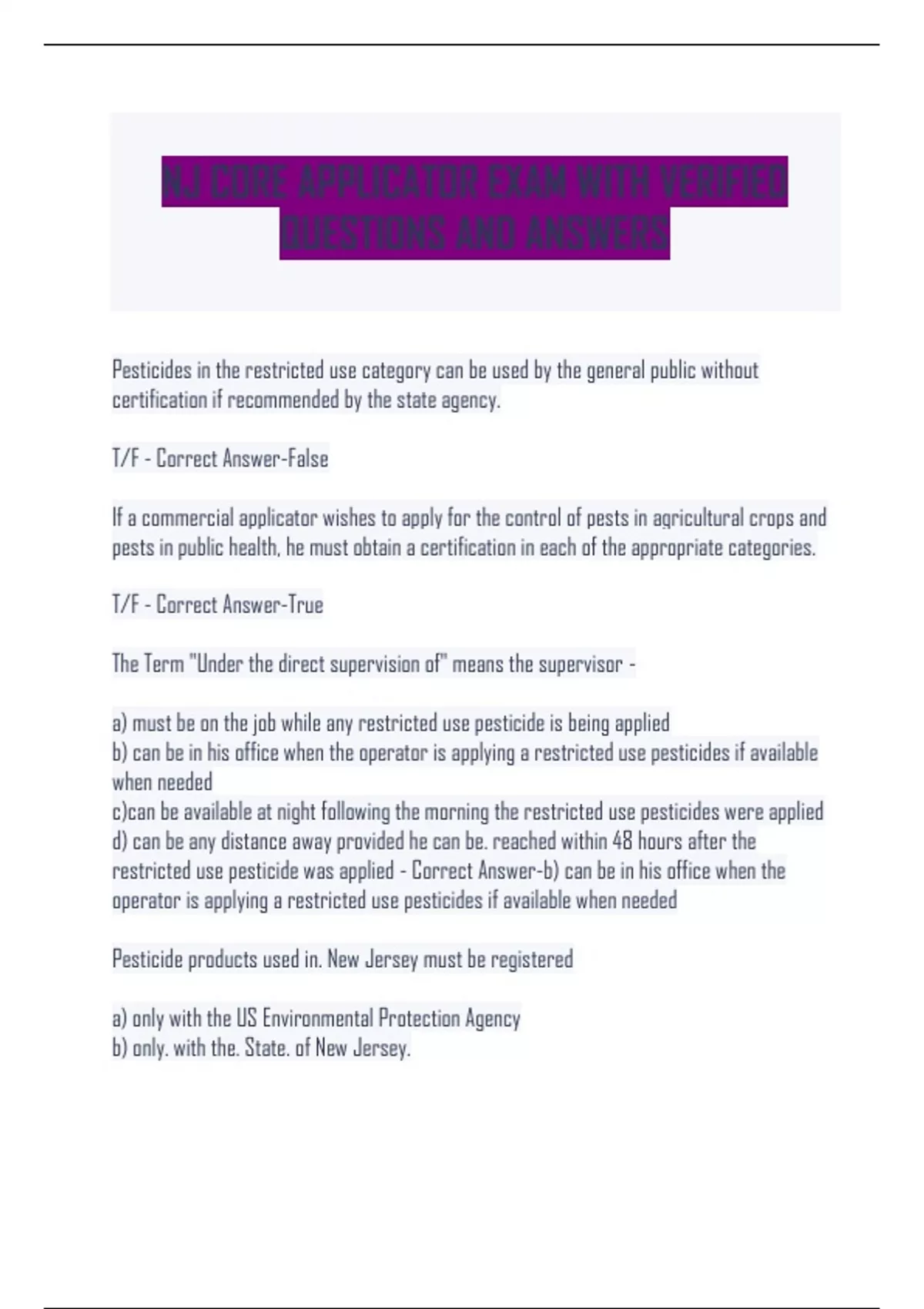 NJ CORE APPLICATOR EXAM WITH VERIFIED QUESTIONS AND ANSWERS Pesticides in the restricted use category can be used by the general public without certification if recommended by the state agency. T/F - Correct Answer-False If a commercial applicator wishes to apply for the control of pests in agricultural crops and pests in public health, he must obtain a certification in each of the appropriate categories. T/F - Correct Answer-True The Term "Under the direct supervision of" means the supervisor - a) must be on the job while any restricted use pesticide is being applied b) can be in his office when the operator is applying a restricted use pesticides if available when needed c)can be available at night following the morning the restricted use pesticides were applied d) can be any distance away provided he can be. reached within 48 hours after the restricted use pesticide was applied - Correct Answer-b) can be in his office when the operator is applying a restricted use pesticides if available when needed Pesticide products used in. New Jersey must be registered a) only with the US Environmental Protection Agency b) only. with the. State. of New Jersey. c) with both the US environmental Protection Agency and state of New Jersey - Correct Answer-c) with both the US environmental Protection Agency and state of New Jersey In New Jersey, restricted use pesticides can only be purchased from a licensed pesticide a) dealer business. b) operator business. c) applicator business - Correct Answer-a) dealer business. Applicators of all pesticides or their supervisors must have state certification.T/F - Correct Answer-True Pesticide applicators may be classified as private applicators if they apply pesticides a) only on their own property b)to produce agricultural commodities primarily on the property of other people c) to produce agricultural commodities on their own property d) on the property of others for hire and their own property - Correct Answer-c) to produce agricultural commodities on their own property Someone who uses any pesticides to raise agricultural product must be certified and registred as. a a) pesticide operator. b) commercial pesticide applicator c) private pesticide applicator - Correct Answer-c) private pesticide applicator Anyone applying pesticides as a service must be certified and registered as a a) pesticide operator. b) commercial pesticide applicator c) private pesticide applicator - Correct Answer-b) commercial pesticide applicator Part of. the certification of commercial pesticide applicators. Involves passing a) core and a category exam b) a dealer exam c) an operator exam - Correct Answer-a) core and a category exam Companies which contract out their services for compensation must be registered as a a) pesticide operation b) pesticide applicator business c) pesticide dealer - Correct Answer-b) pesticide applicator business What is required before any commercial applications of pesticides are made for household pest control? a) notification of persons b) a detailed bill c) none of the above - Correct Answer-a) notification of persons Persons applying pesticides under the direct supervision of a Commercial Pesticide Applicator who is not physically present on the application site must be registered as a pesticide a) dealer b) operator c) technician - Correct Answer-b) operator Records of application must be kept for a minimum of a) 5 years for termite and 3 years for other Commercial Applicators b) 4 years c) 1 Year - Correct Answer-a) 5 years for termite and 3 years for other Commercial Applicators An inventory list of pesticides likely to be in storage must be. a) kept in a. storage. area b) updated every 2 years c) forwarded to the local fire department - Correct Answer-c) forwarded to the local fire department What is the full name and acronym. of the federal agency mandated to regulate pesticides? - Correct Answer-Environmental Protection Agency - EPA What is the full name and acronym for the law EPA uses to manage pesticides? - Correct Answer-Federal Insecticide, Fungicide and Rodenticide Act