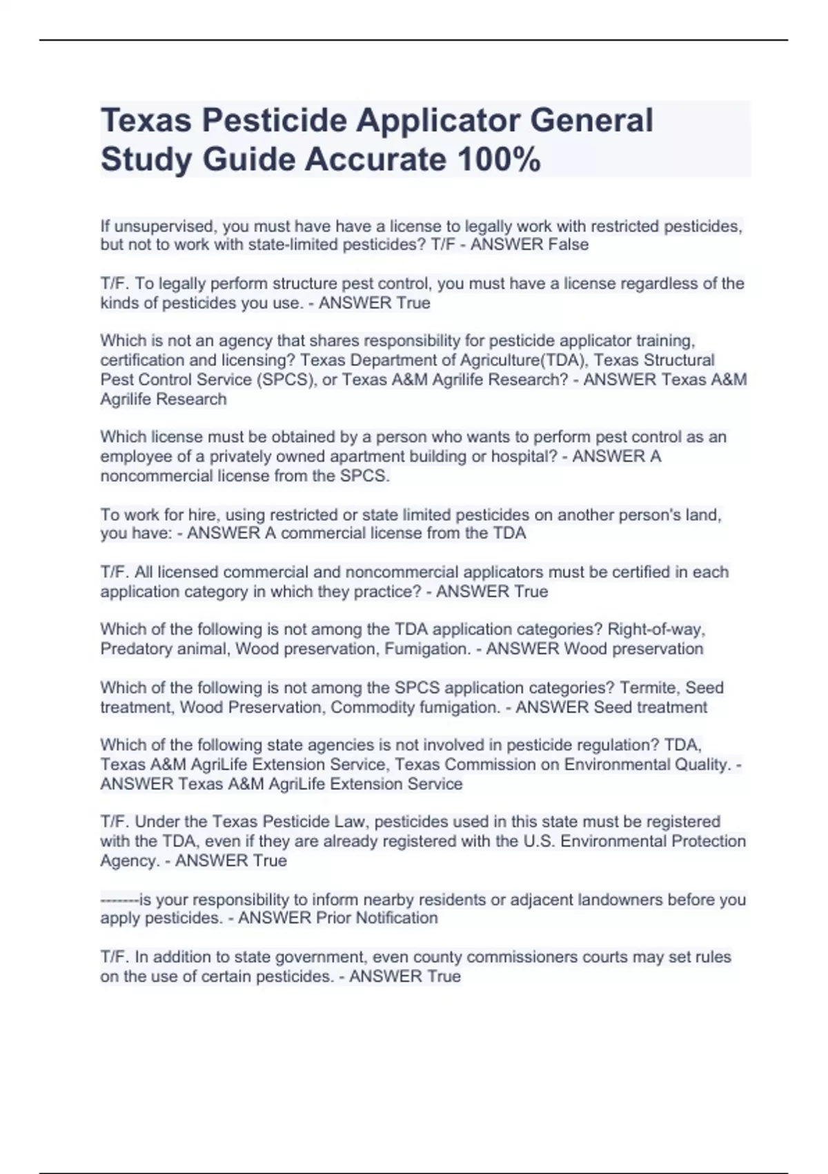 If unsupervised, you must have have a license to legally work with restricted pesticides, but not to work with state-limited pesticides? T/F - ANSWER False T/F. To legally perform structure pest control, you must have a license regardless of the kinds of pesticides you use. - ANSWER True Which is not an agency that shares responsibility for pesticide applicator training, certification and licensing? Texas Department of Agriculture(TDA), Texas Structural Pest Control Service (SPCS), or Texas A&M Agrilife Research? - ANSWER Texas A&M Agrilife Research Which license must be obtained by a person who wants to perform pest control as an employee of a privately owned apartment building or hospital? - ANSWER A noncommercial license from the SPCS. To work for hire, using restricted or state limited pesticides on another person's land, you have: - ANSWER A commercial license from the TDA T/F. All licensed commercial and noncommercial applicators must be certified in each application category in which they practice? - ANSWER True Which of the following is not among the TDA application categories? Right-of-way, Predatory animal, Wood preservation, Fumigation. - ANSWER Wood preservation Which of the following is not among the SPCS application categories? Termite, Seed treatment, Wood Preservation, Commodity fumigation. - ANSWER Seed treatment Which of the following state agencies is not involved in pesticide regulation? TDA, Texas A&M AgriLife Extension Service, Texas Commission on Environmental Quality. - ANSWER Texas A&M AgriLife Extension Service T/F. Under the Texas Pesticide Law, pesticides used in this state must be registered with the TDA, even if they are already registered with the U.S. Environmental Protection Agency. - ANSWER True -------is your responsibility to inform nearby residents or adjacent landowners before you apply pesticides. - ANSWER Prior Notification T/F. In addition to state government, even county commissioners courts may set rules on the use of certain pesticides. - ANSWER True