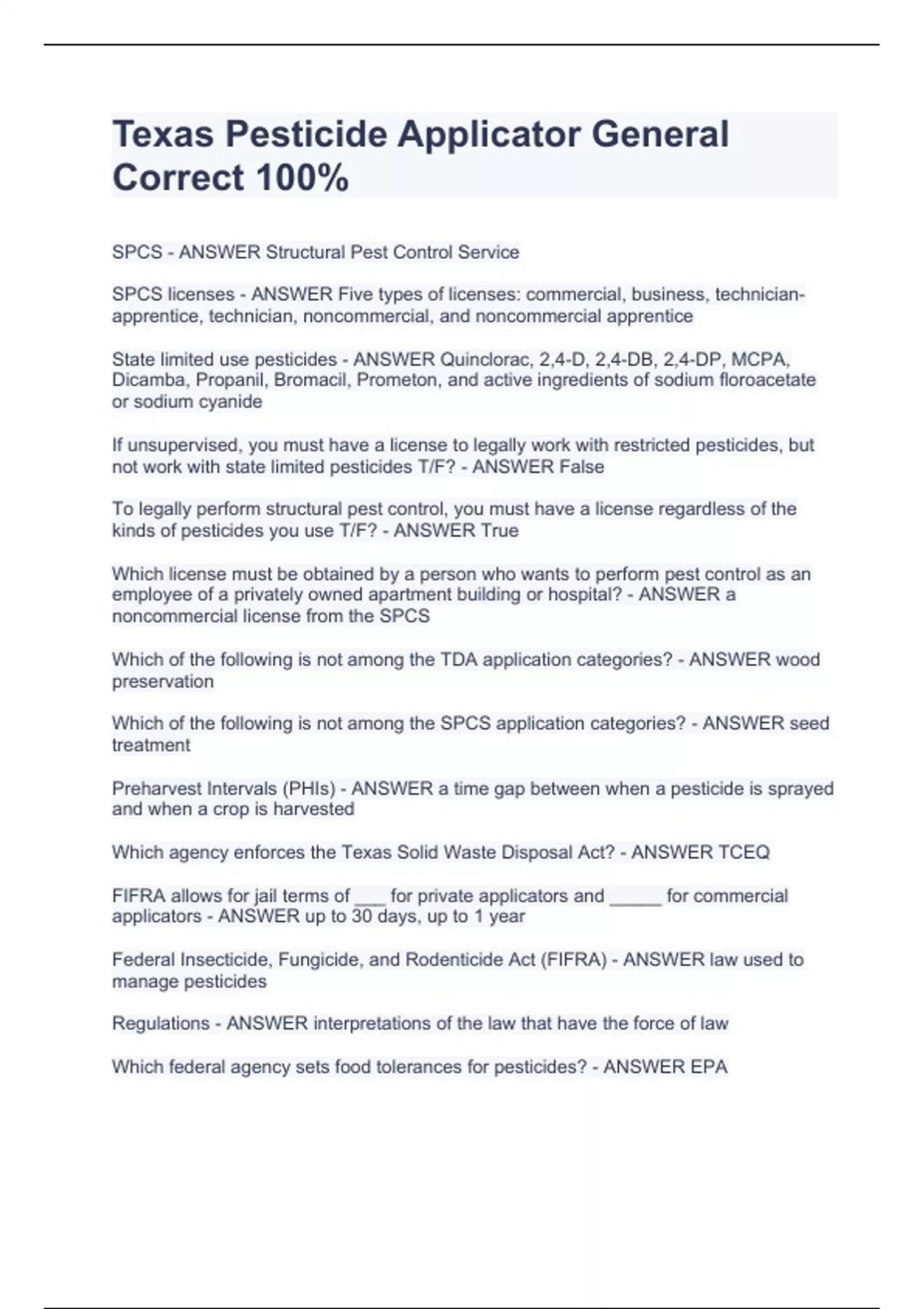 SPCS - ANSWER Structural Pest Control Service SPCS licenses - ANSWER Five types of licenses: commercial, business, technician-apprentice, technician, noncommercial, and noncommercial apprentice State limited use pesticides - ANSWER Quinclorac, 2,4-D, 2,4-DB, 2,4-DP, MCPA, Dicamba, Propanil, Bromacil, Prometon, and active ingredients of sodium floroacetate or sodium cyanide If unsupervised, you must have a license to legally work with restricted pesticides, but not work with state limited pesticides T/F? - ANSWER False To legally perform structural pest control, you must have a license regardless of the kinds of pesticides you use T/F? - ANSWER True Which license must be obtained by a person who wants to perform pest control as an employee of a privately owned apartment building or hospital? - ANSWER a noncommercial license from the SPCS Which of the following is not among the TDA application categories? - ANSWER wood preservation Which of the following is not among the SPCS application categories? - ANSWER seed treatment