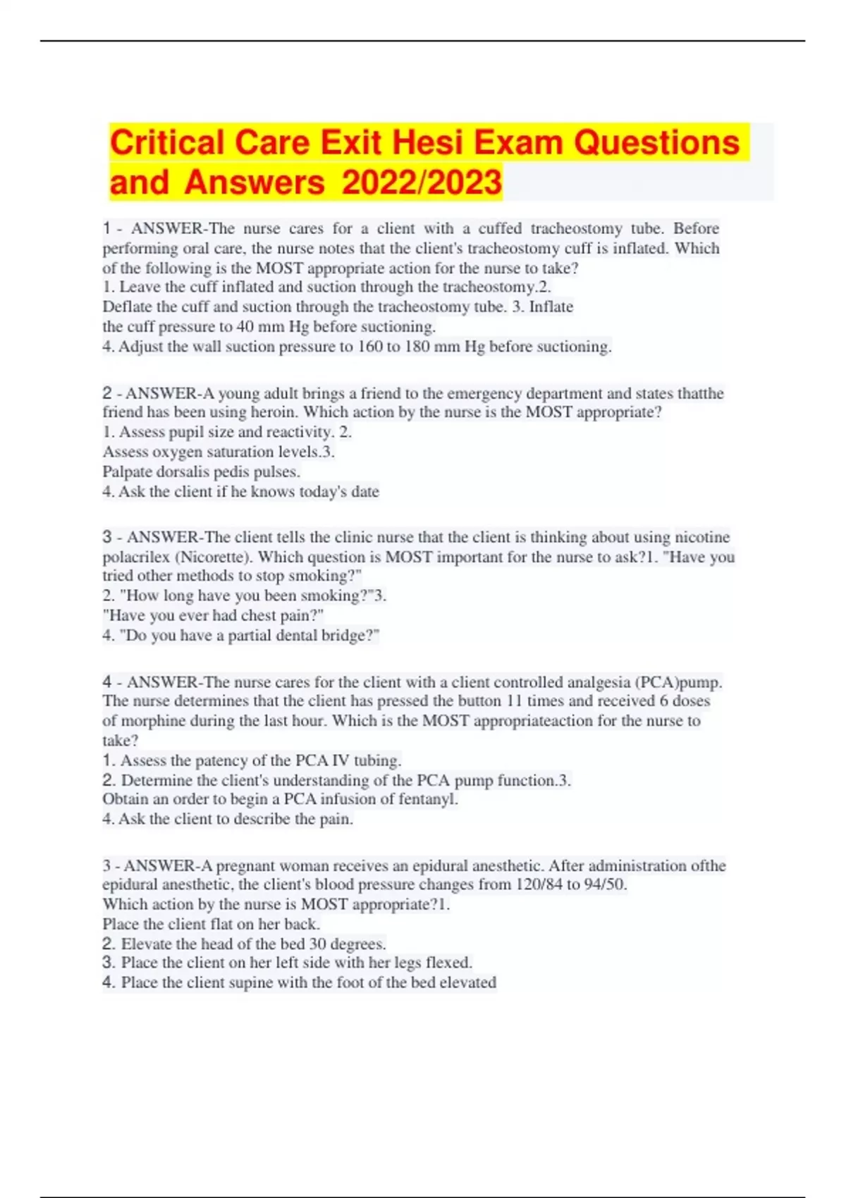 Critical Care Exit Hesi Exam Questions and Answers 2022/2023 - ANSWER-The nurse cares for a client with a cuffed tracheostomy tube. Before performing oral care, the nurse notes that the client's tracheostomy cuff is inflated. Which of the following is the MOST appropriate action for the nurse to take? 1. Leave the cuff inflated and suction through the tracheostomy.2. Deflate the cuff and suction through the tracheostomy tube. 3. Inflate the cuff pressure to 40 mm Hg before suctioning. 4. Adjust the wall suction pressure to 160 to 180 mm Hg before suctioning. 2 - ANSWER-A young adult brings a friend to the emergency department and states thatthe friend has been using heroin. Which action by the nurse is the MOST appropriate? 1. Assess pupil size and reactivity. 2. Assess oxygen saturation levels.3. Palpate dorsalis pedis pulses. 4. Ask the client if he knows today's date 3 - ANSWER-The client tells the clinic nurse that the client is thinking about using nicotine polacrilex (Nicorette). Which question is MOST important for the nurse to ask?1. "Have you tried other methods to stop smoking?" 2. "How long have you been smoking?"3. "Have you ever had chest pain?" 4. "Do you have a partial dental bridge?" 4 - ANSWER-The nurse cares for the client with a client controlled analgesia (PCA)pump. The nurse determines that the client has pressed the button 11 times and received 6 doses of morphine during the last hour. Which is the MOST appropriateaction for the nurse to take? 1. Assess the patency of the PCA IV tubing. 2. Determine the client's understanding of the PCA pump function.3. Obtain an order to begin a PCA infusion of fentanyl. 4. Ask the client to describe the pain. 3 - ANSWER-A pregnant woman receives an epidural anesthetic. After administration ofthe epidural anesthetic, the client's blood pressure changes from 120/84 to 94/50. Which action by the nurse is MOST appropriate?1. Place the client flat on her back. 2. Elevate the head of the bed 30 degrees. 3. Place the client on her left side with her legs flexed. 4. Place the client supine with the foot of the bed elevated