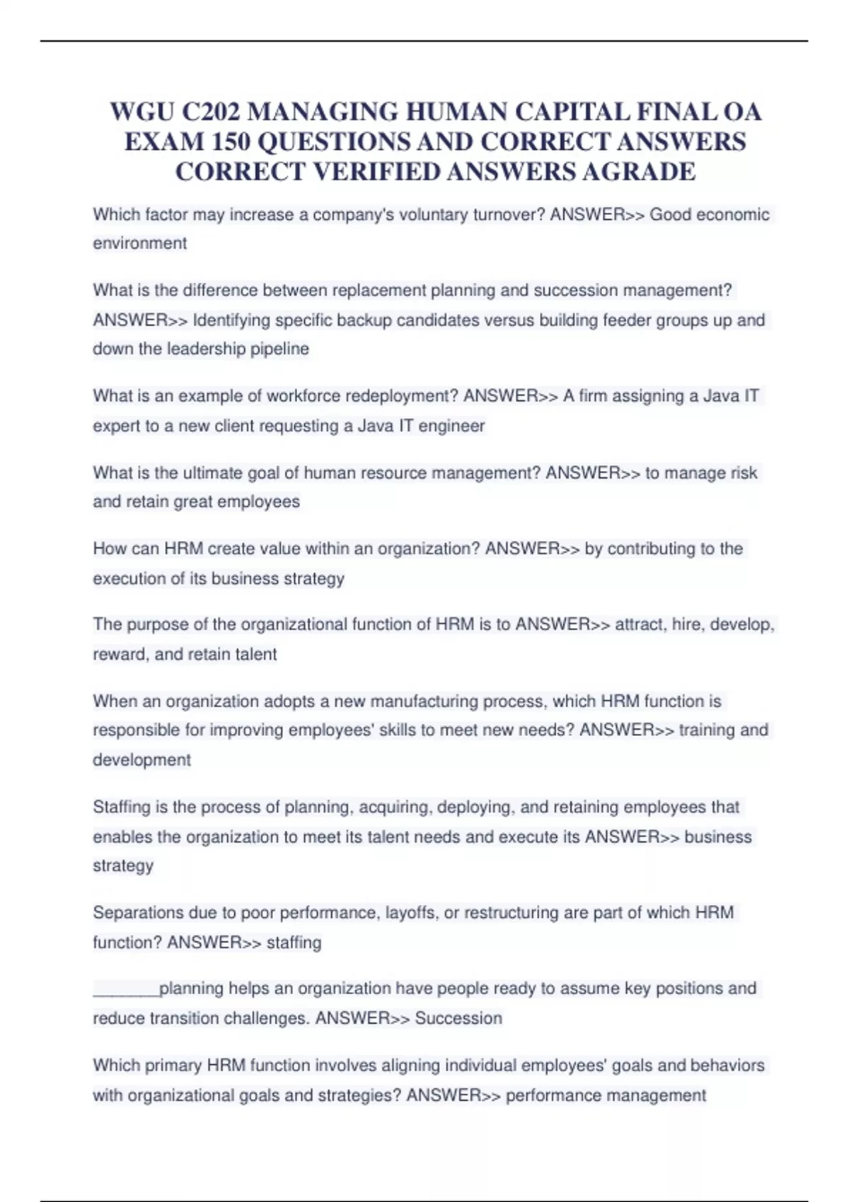 WGU C202 MANAGING HUMAN CAPITAL FINAL OA EXAM 150 QUESTIONS AND CORRECT ANSWERS GRADED A