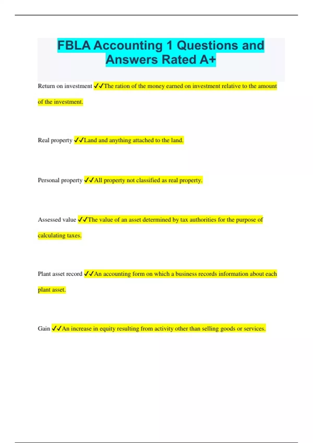 FBLA Accounting 1 Questions and Answers Rated A+ Return on investment The ration of the money earned on investment relative to the amount of the investment. Real property Land and anything attached to the land. Personal property All property not classified as real property. Assessed value The value of an asset determined by tax authorities for the purpose of calculating taxes. Plant asset record An accounting form on which a business records information about each plant asset. Gain An increase in equity resulting from activity other than selling goods or services. Gain on plant assets An increase in equity that results when a plant asset is sold for more than book value. Loss A decrease in equity resulting from activity other than selling goods or services. Loss on plant assets The decrease in equity that results when a plant asset is sold for less than book value. Accelerated depreciation Any method of depreciation which records greater depreciation expense in the early years and less depreciation expense in the later years. Declining-balance method of depreciation A type of accelerated depreciation that multiplies the book value of an asset by a constant depreciation rate to determine annual depreciation. Double-declining balance method of depreciation A declining-balance rate that is two times the straight-line rate. Intangible asset An asset that does not have physical substance. Amortization The spreading of the cost of an intangible asset over its useful life. real property land and anything attached to the land personal property all property not classified as real property assessed value The value of an asset determined by tax authorities for the purpose of calculating taxes plant asset record An accounting form on which a business records information about each plant asset. gain on plant assets Revenue that results when a plant asset is sold for more than book value. loss on plant assets The loss that results when a plant asset is sold for less than book value. payroll list of a business's employees and the payment due to each employee for a specific pay period pay period amount of time for which an employee is paid payroll clerk a person who is responsible for preparing the payroll gross earnings total amount of money earned by an employee in a pay period salary fixed amount of money paid to an employee for each pay period wage amount of money paid to an employee at a specificed rate per hour worked time card record of the time an employee arrives at work
