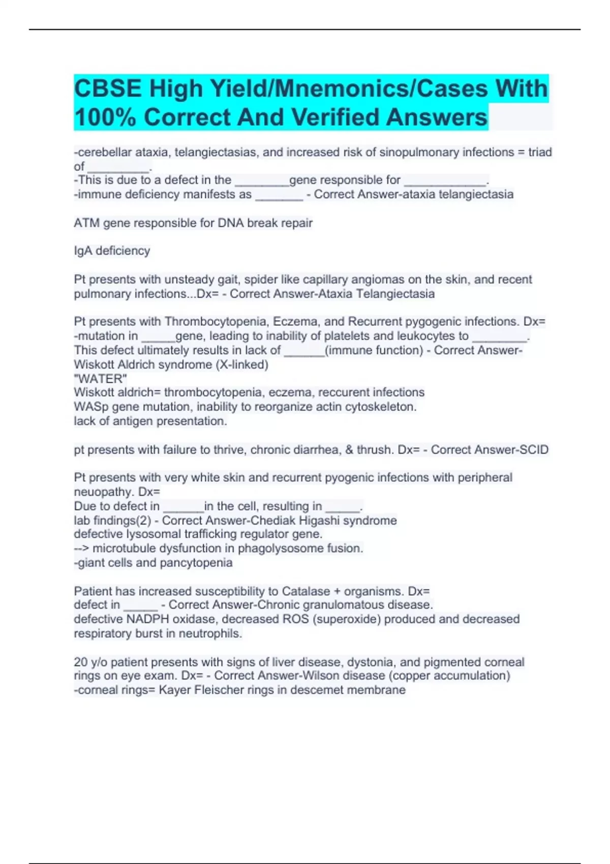 CBSE High Yield/Mnemonics/Cases With 100% Correct And Verified Answers