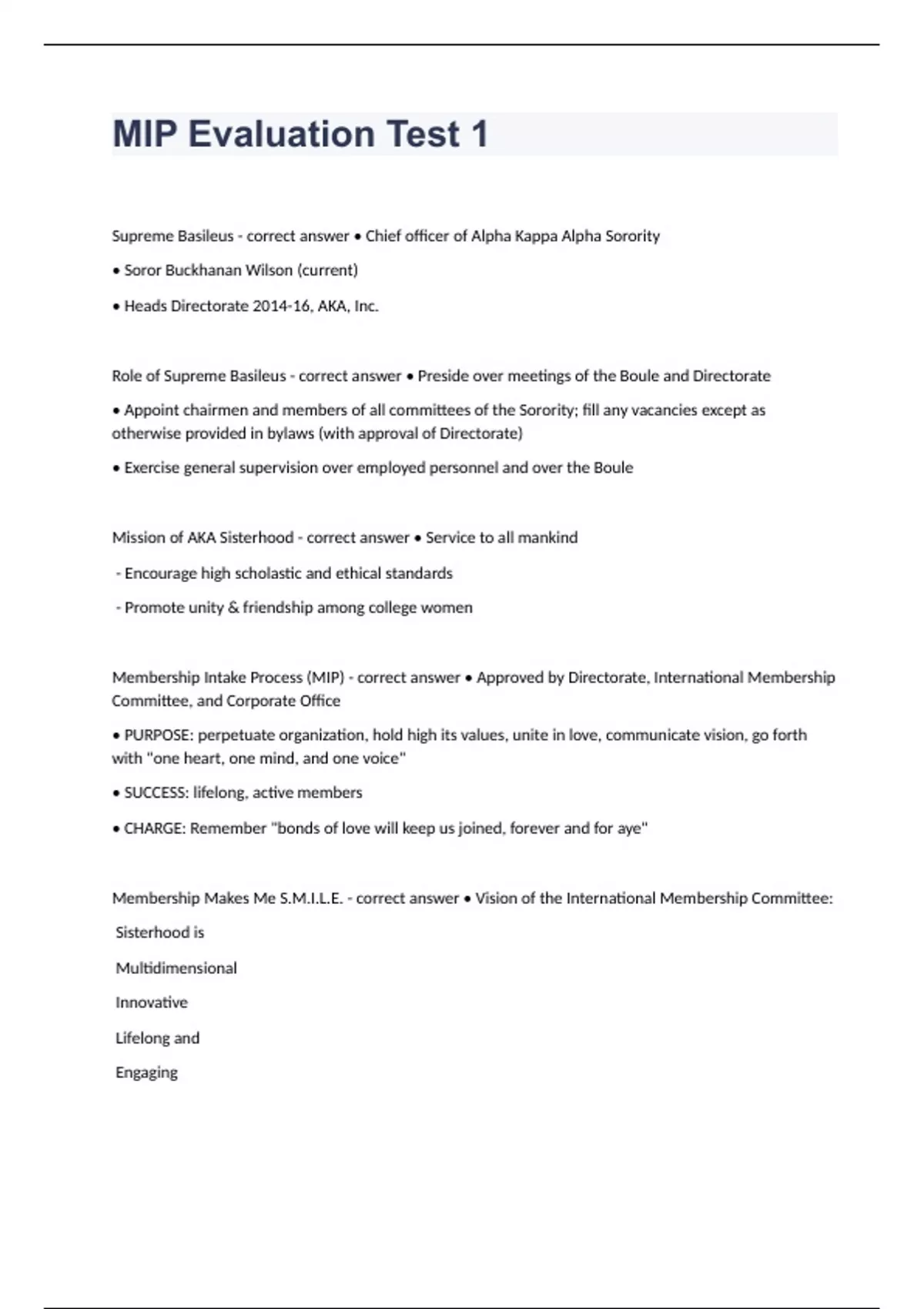 MIP Evaluation Test 1 Question and answers correctly solved 2023/2024 Supreme Basileus - correct answer • Chief officer of Alpha Kappa Alpha Sorority • Soror Buckhanan Wilson (current) • Heads Directorate 2014-16, AKA, Inc. Role of Supreme Basileus - correct answer • Preside over meetings of the Boule and Directorate • Appoint chairmen and members of all committees of the Sorority; fill any vacancies except as otherwise provided in bylaws (with approval of Directorate) • Exercise general supervision over employed personnel and over the Boule Mission of AKA Sisterh