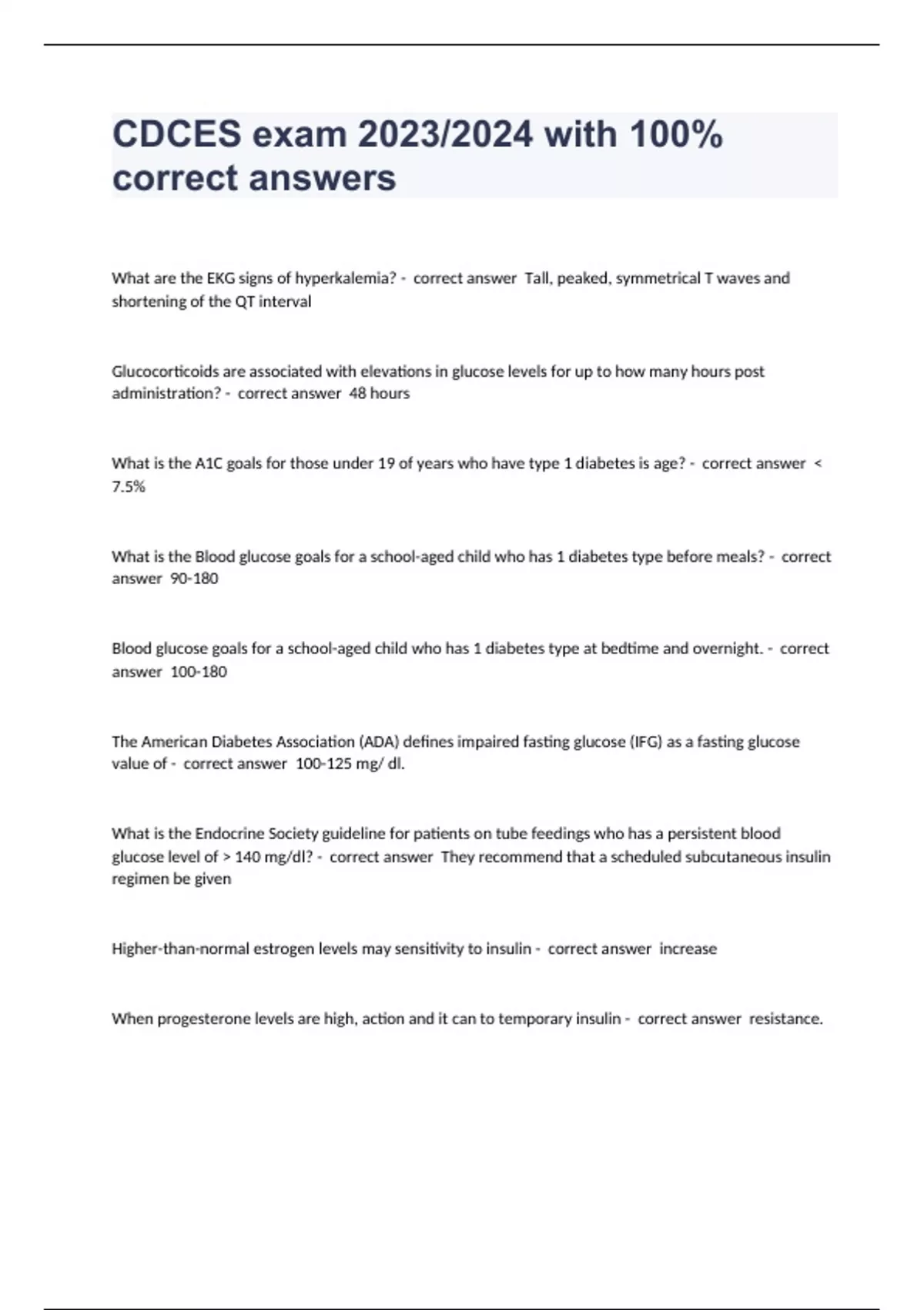What are the EKG signs of hyperkalemia? - correct answer Tall, peaked, symmetrical T waves and shortening of the QT interval Glucocorticoids are associated with elevations in glucose levels for up to how many hours post administration? - correct answer 48 hours What is the A1C goals for those under 19 of years who have type 1 diabetes is age? - correct answer 7.5% What is the Blood glucose goals for a school-aged child who has 1 diabetes type before meals? - correct answer 90-180 Blood glucose goals for a school-aged child who has 1 diabetes type at bedtime and overnight. - correct answer 100-180 The American Diabetes Association (ADA) defines impaired fasting glucose (IFG) as a fasting glucose value of - correct answer 100-125 mg/ dl. What is the Endocrine Society guideline for patients on tube feedings who has a persistent blood glucose level of 140 mg/dl? - correct answer They recommend that a scheduled subcutaneous insulin regimen be given Higher-than-normal estrogen levels may sensitivity to insulin - correct answer increase When progesterone levels are high, action and it can to temporary insulin - correct answer resistance. Women with