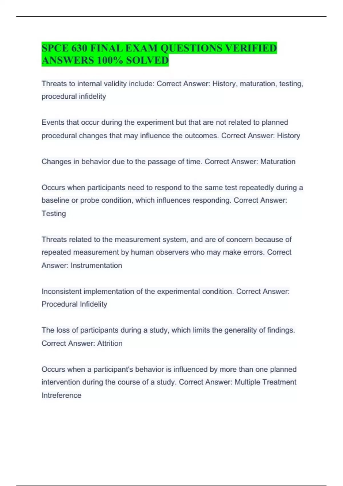 SPCE 630 FINAL EXAM QUESTIONS VERIFIED ANSWERS 100% SOLVED Threats to internal validity include: Correct Answer: History, maturation, testing, procedural infidelity Events that occur during the experiment but that are not related to planned procedural changes that may influence the outcomes. Correct Answer: History Changes in behavior due to the passage of time. Correct Answer: Maturation Occurs when participants need to respond to the same test repeatedly during a baseline or probe condition, which influences responding. Correct Answer: Testing Threats related to the measurement system, and are of concern because of repeated measurement by human observers who may make errors. Correct Answer: Instrumentation Inconsistent implementation of the experimental condition. Correct Answer: Procedural Infidelity The loss of participants during a study, which limits the generality of findings. Correct Answer: Attrition Occurs when a participant's behavior is influenced by more than one planned intervention during the course of a study. Correct Answer: Multiple Treatment Intreference A type of data instability that refers to a repeated and predictable pattern in the data series over time. Correct Answer: Cyclical Variability Carryover effects: Correct Answer: NOT: Is best described as the effect of a